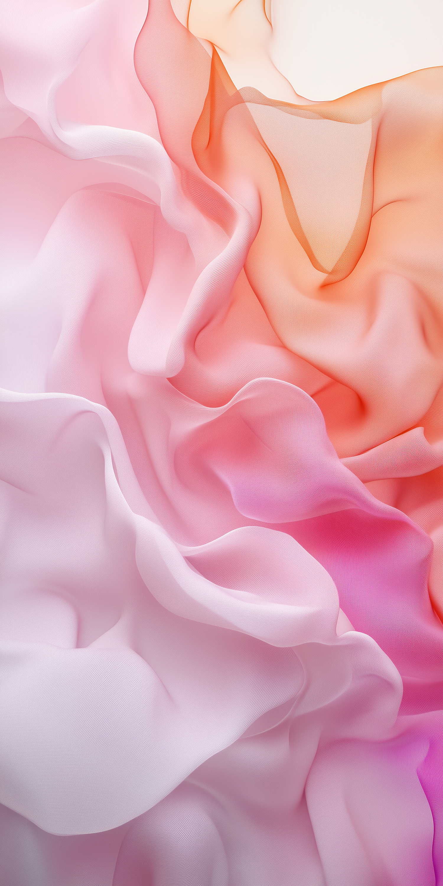Delicate pastel fabric layers in pink, peach, and white, flowing and rippling in an ethereal, abstract composition.