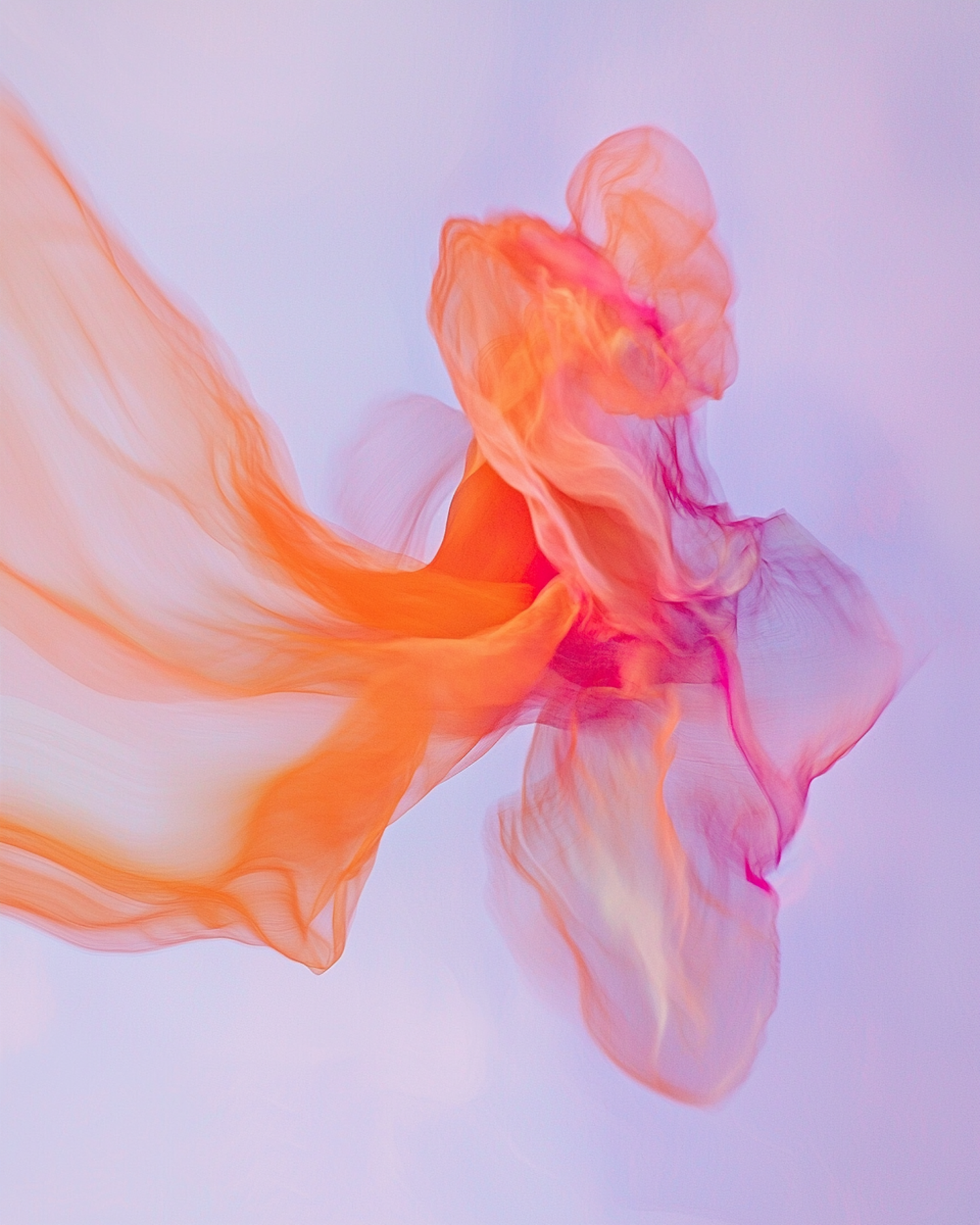 Abstract flowing fabric in orange, pink, and purple hues against a soft blue background, creating a dreamy and dynamic visual effect.
