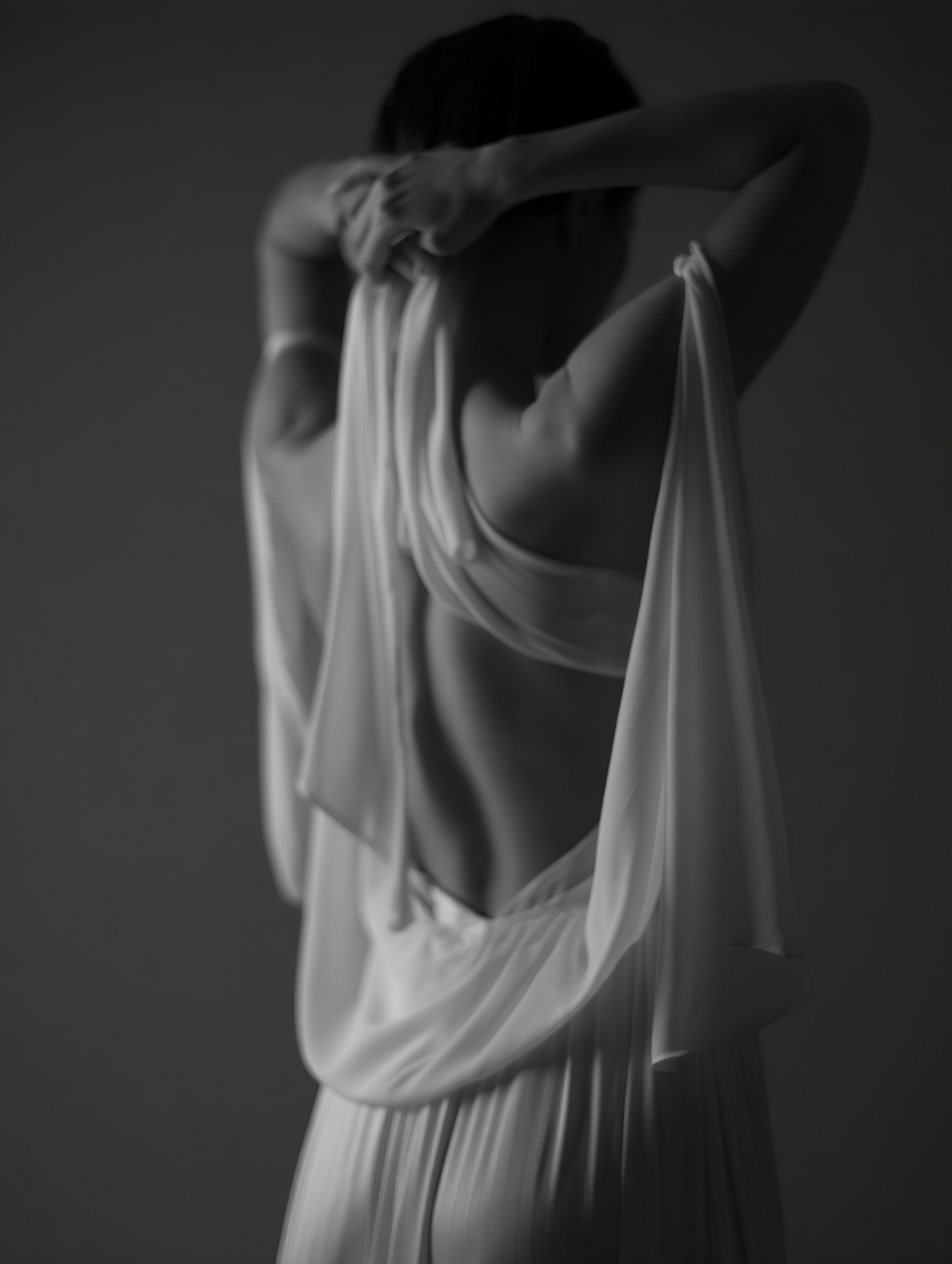Monochrome image of a person adjusting a flowing garment, showcasing elegant drapery and soft lighting for a serene, artistic vibe.