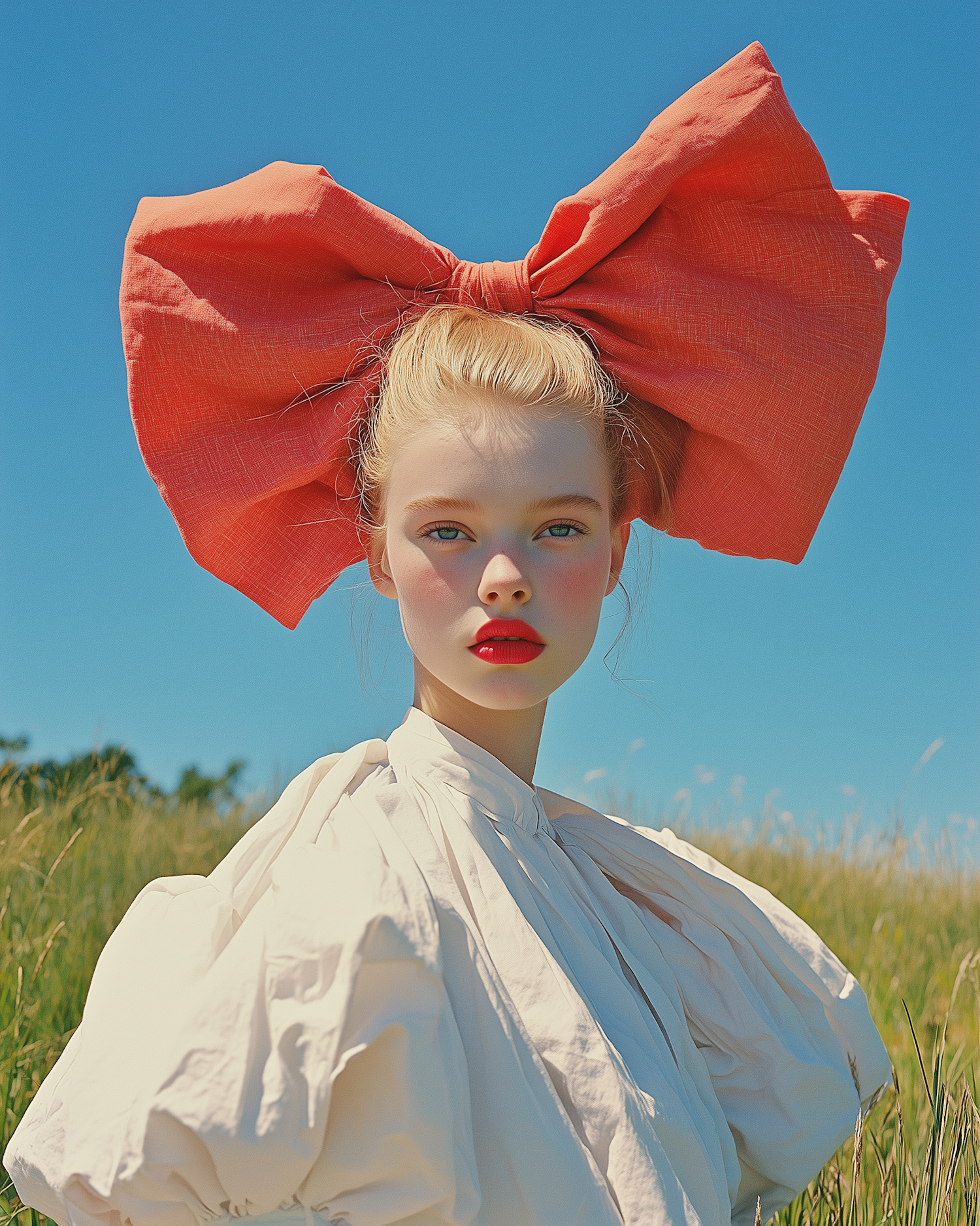 A striking portrait of a woman in a white blouse and oversized coral bow, set against a bright blue sky and grassy field.