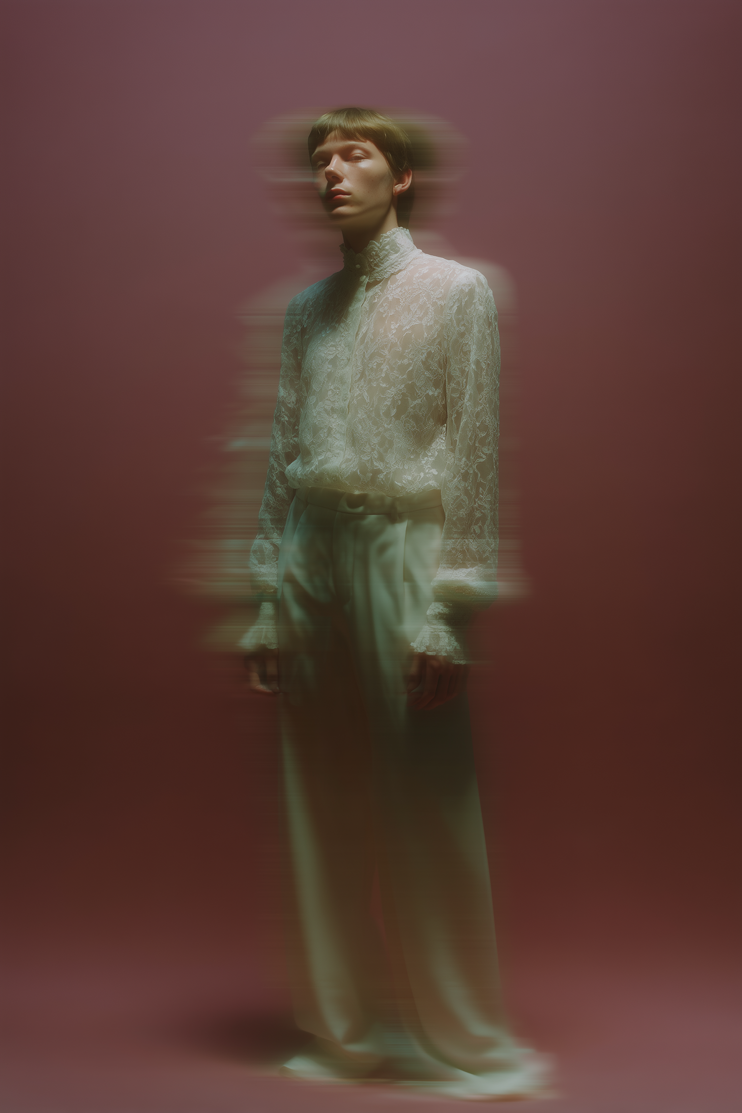 A dreamy portrait of a person in a lace blouse and white trousers, with a blurred effect against a muted pink background.