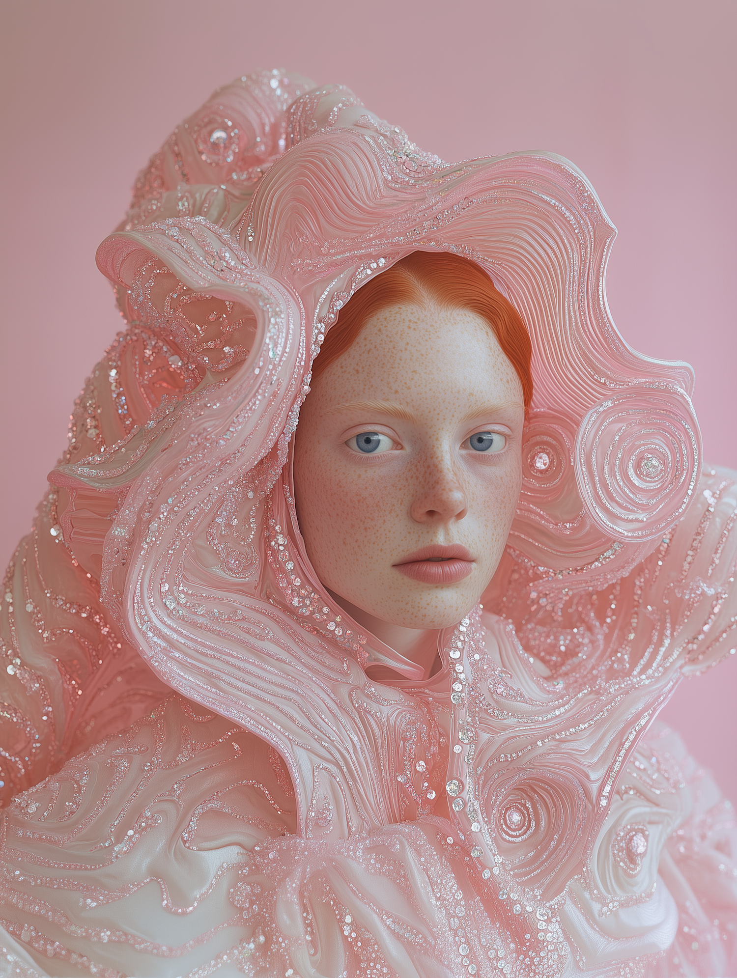 A young woman in an intricate pink, beaded garment with a sculptural hood, set against a soft pink background.