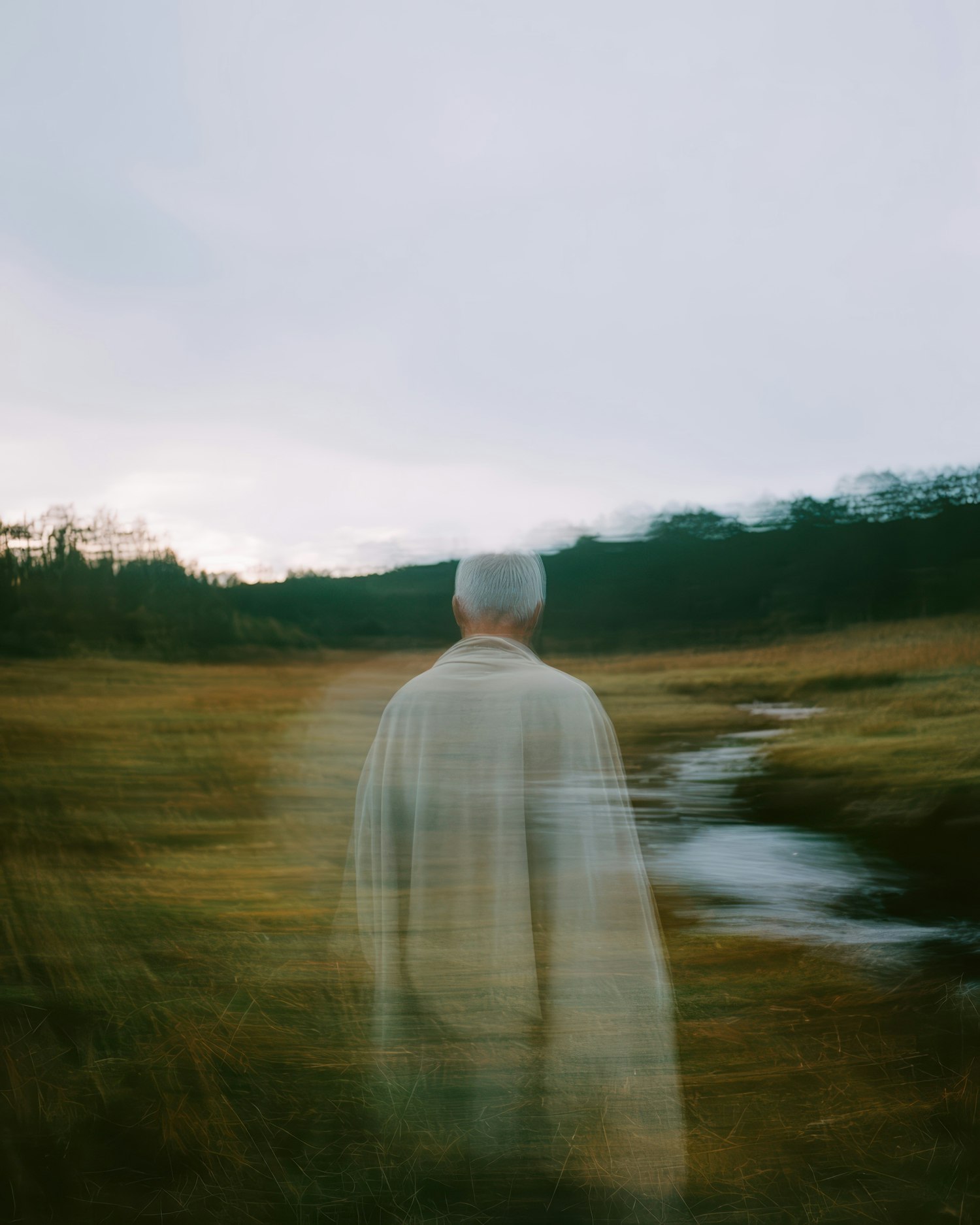 A person in a flowing garment stands in a blurred, dreamy field near a stream, evoking a serene and ethereal atmosphere.