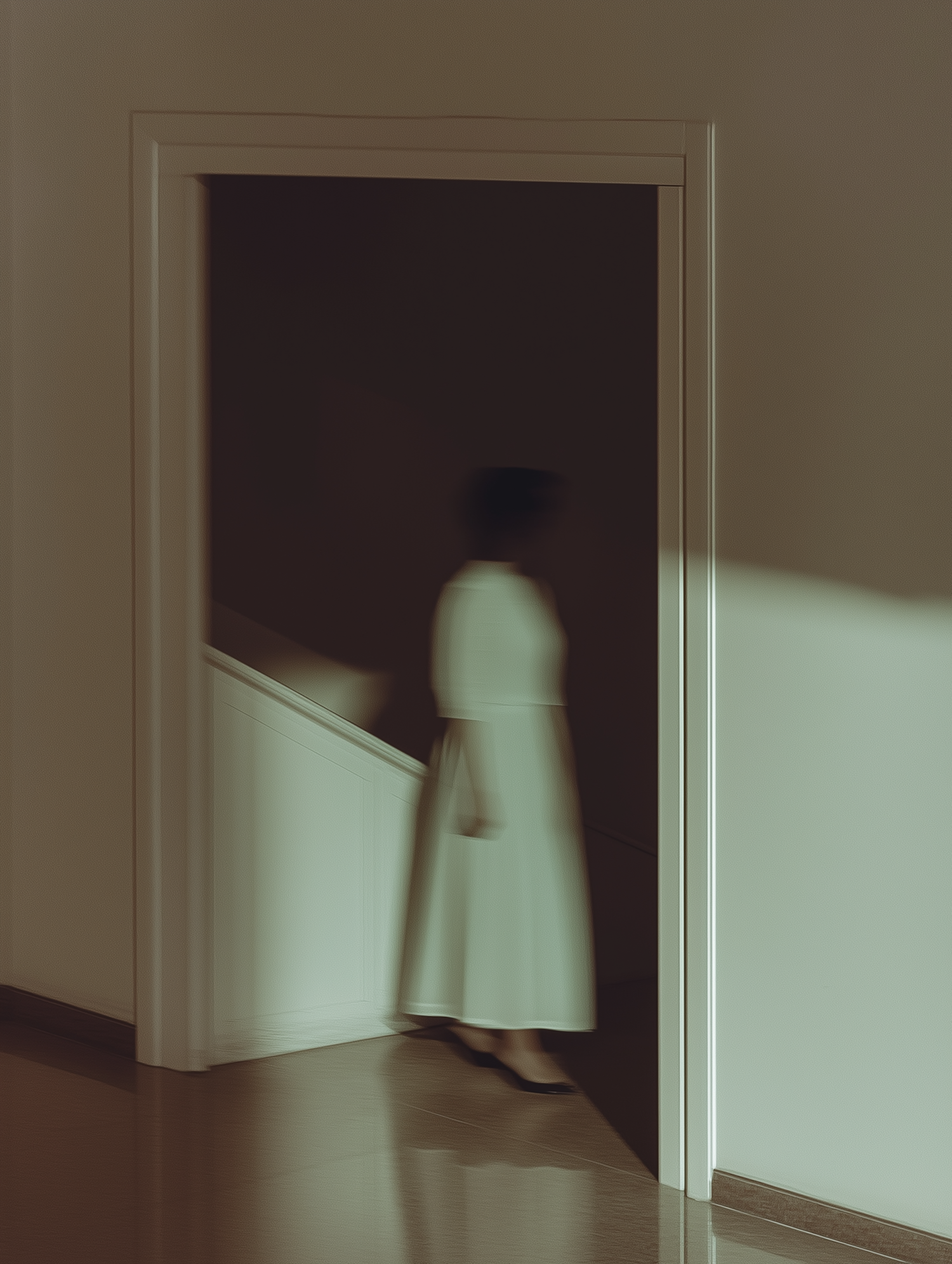 Blurred figure in white dress walking through a doorway, creating a ghostly effect in dim lighting.