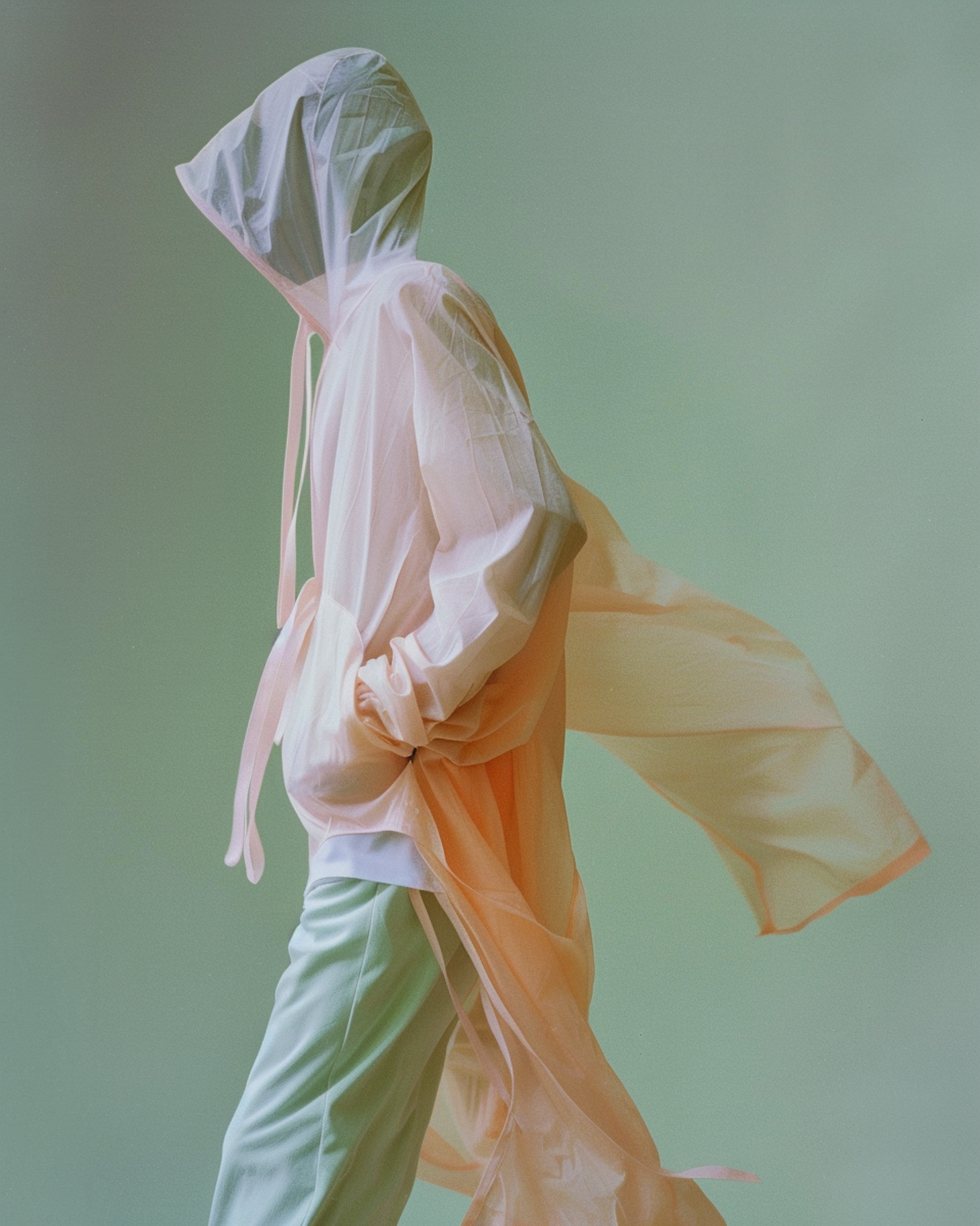 A person in a translucent hooded garment in pastel colors against a green background, creating a serene and ethereal look.