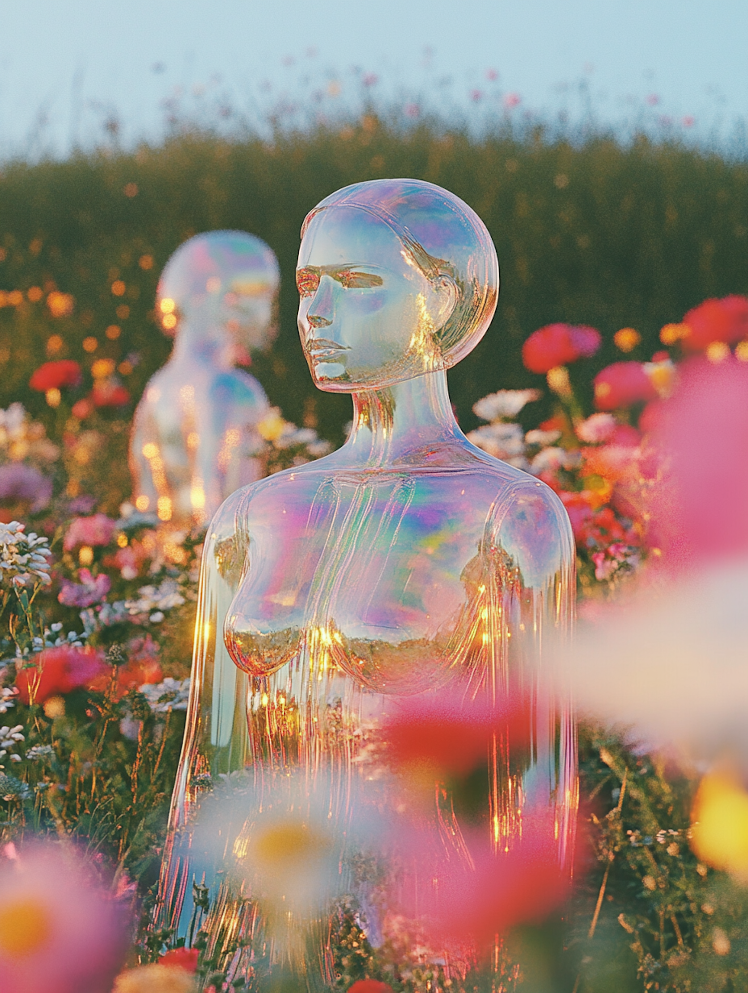 Iridescent humanoid figures in a vibrant wildflower field, blending futuristic aesthetics with natural beauty under a clear sky.