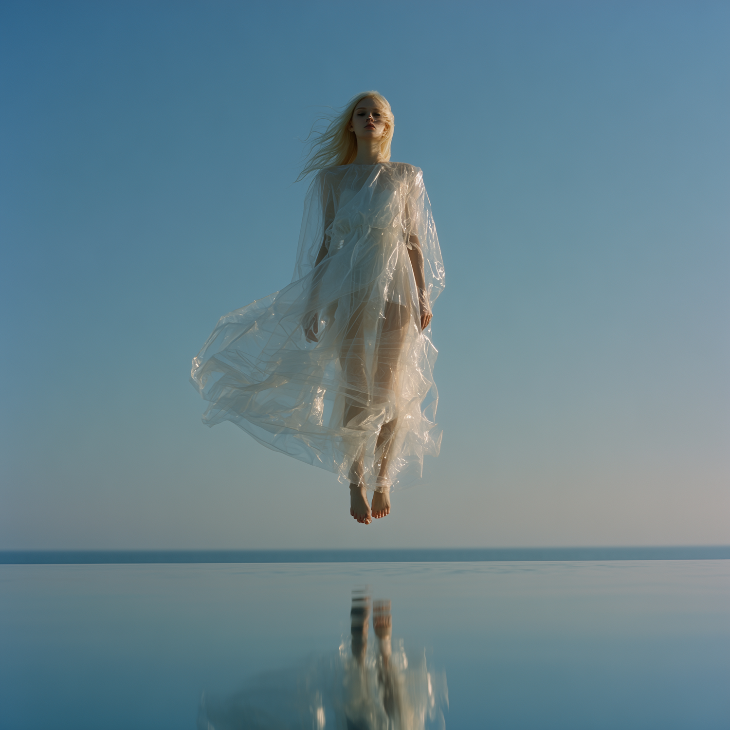 A serene, dreamlike scene of a person in a translucent dress floating above a reflective surface under a clear blue sky.