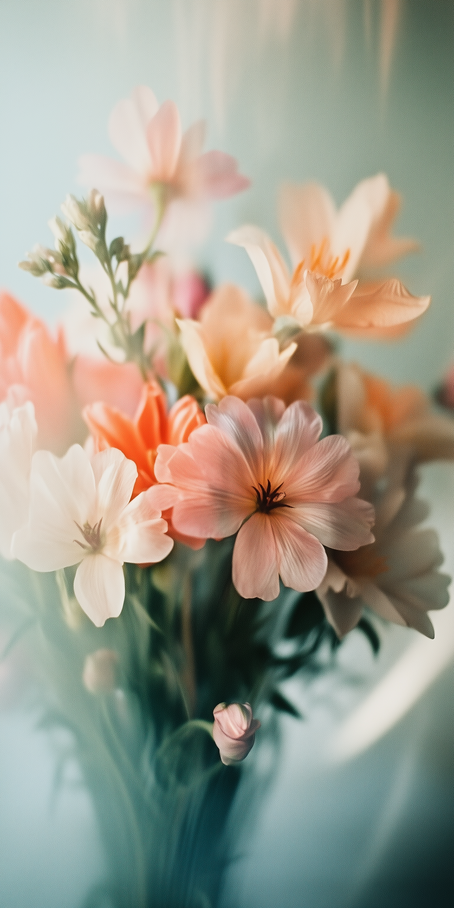 A delicate bouquet of pastel flowers with soft lighting and a blurred background, creating an ethereal and tranquil scene.