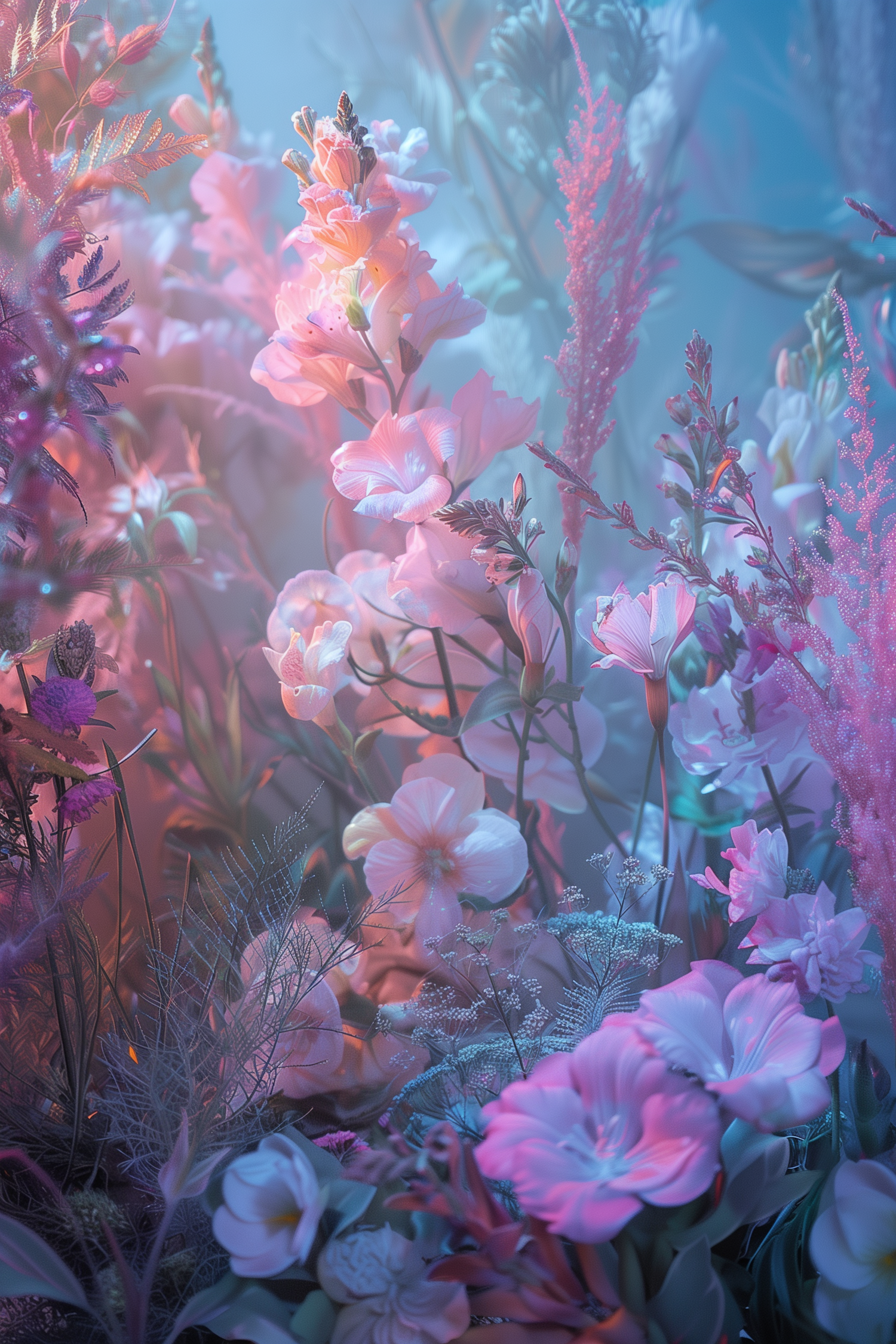 Ethereal floral scene with pastel blooms in soft pinks, purples, and blues, creating a dreamy and tranquil atmosphere.