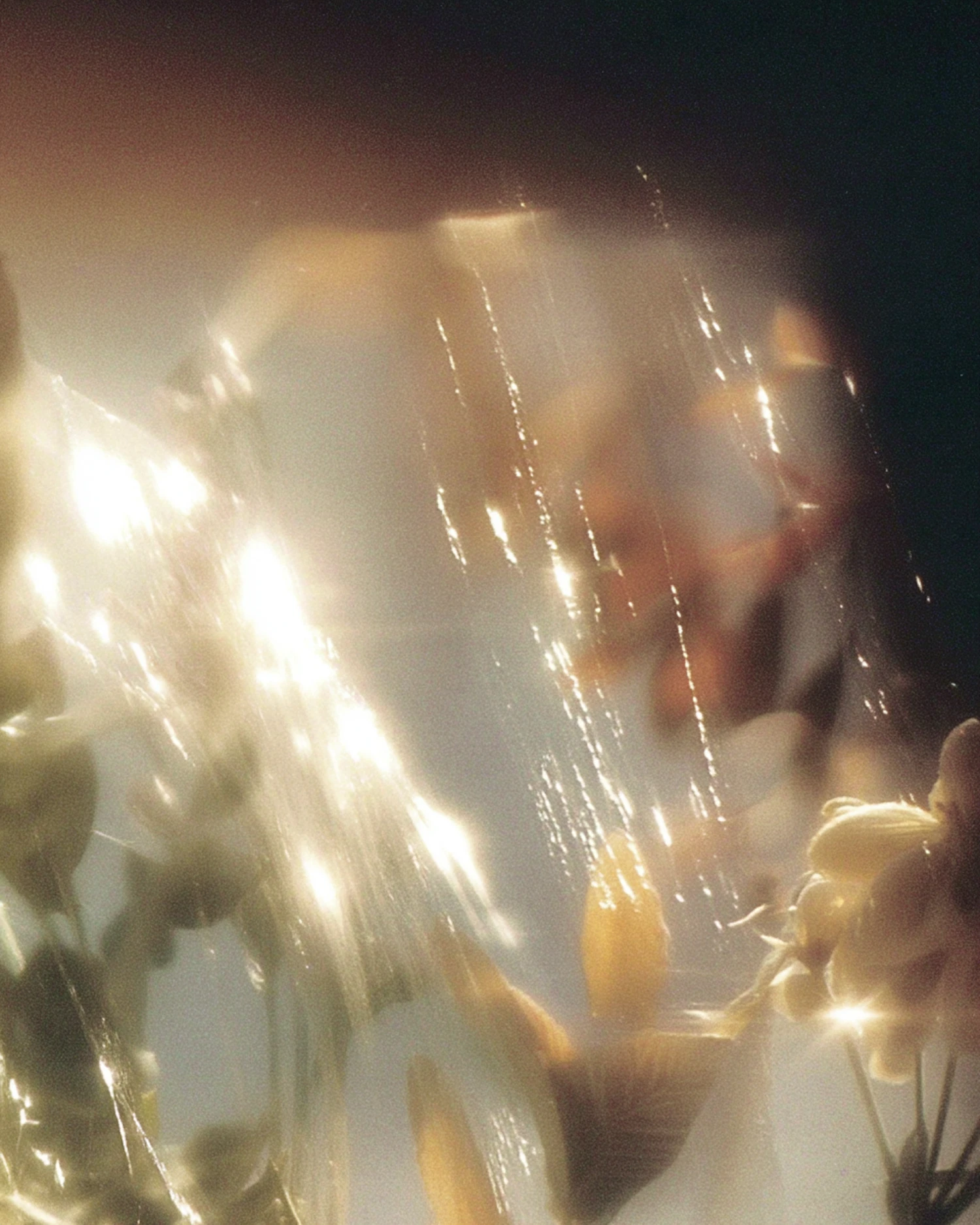 A dreamy, abstract image with glowing light refracting through a translucent surface, highlighting blurred flowers in warm tones.