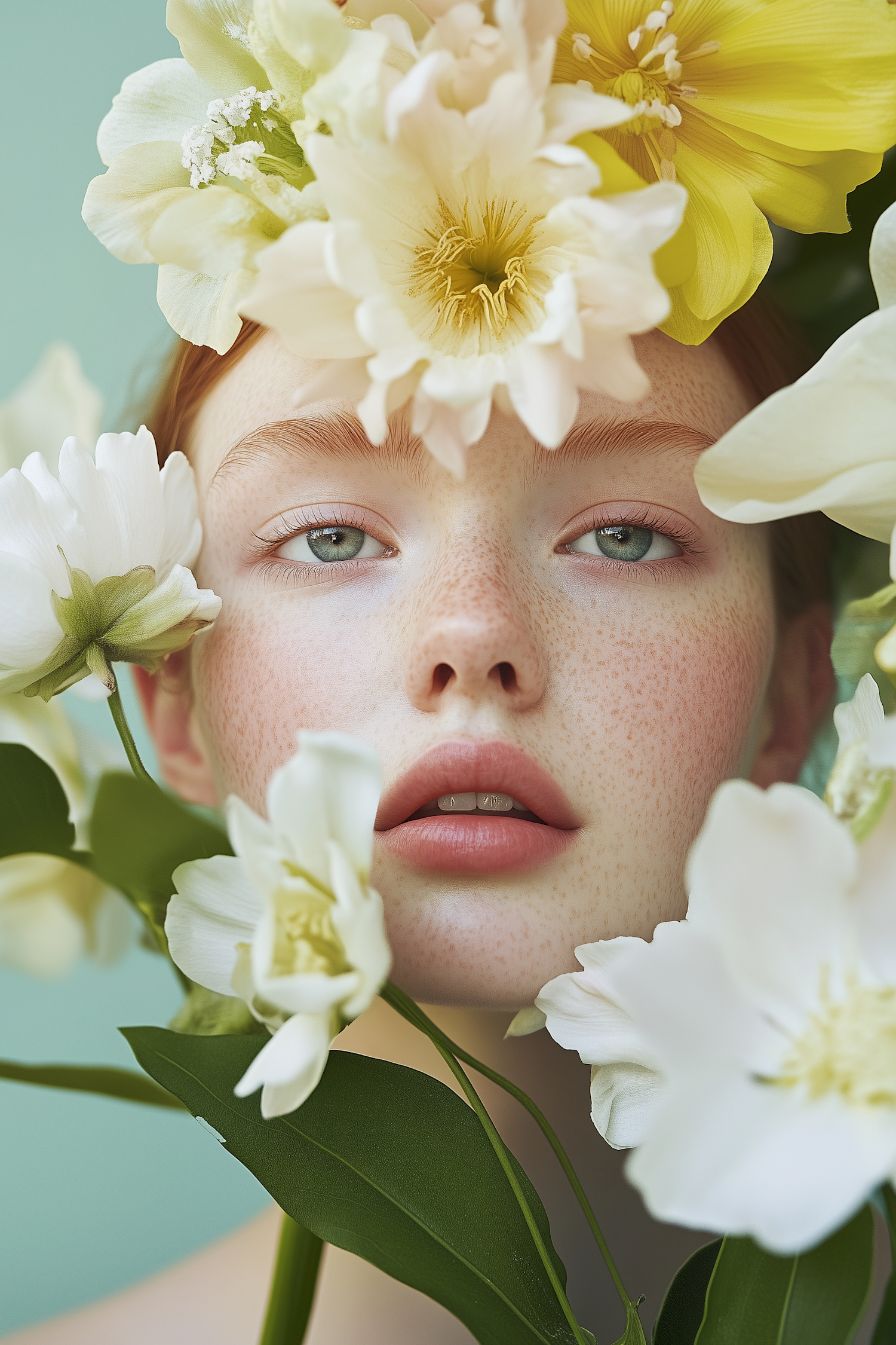 Close-up of a freckled woman with red hair surrounded by white and yellow flowers, set against a teal background.