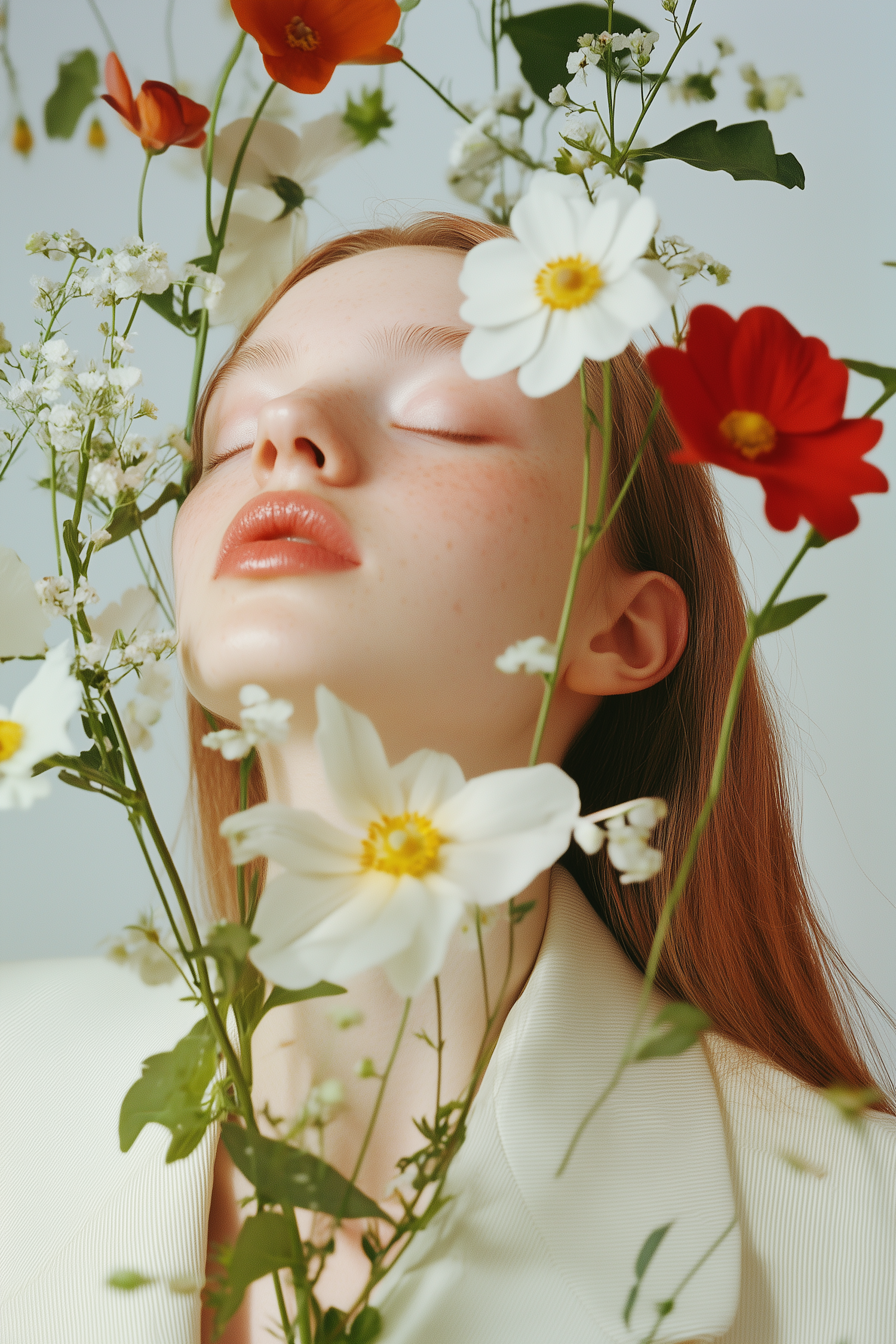 A serene portrait of a woman surrounded by vibrant flowers, featuring white daisies and red blossoms, creating a dreamy, natural vibe.