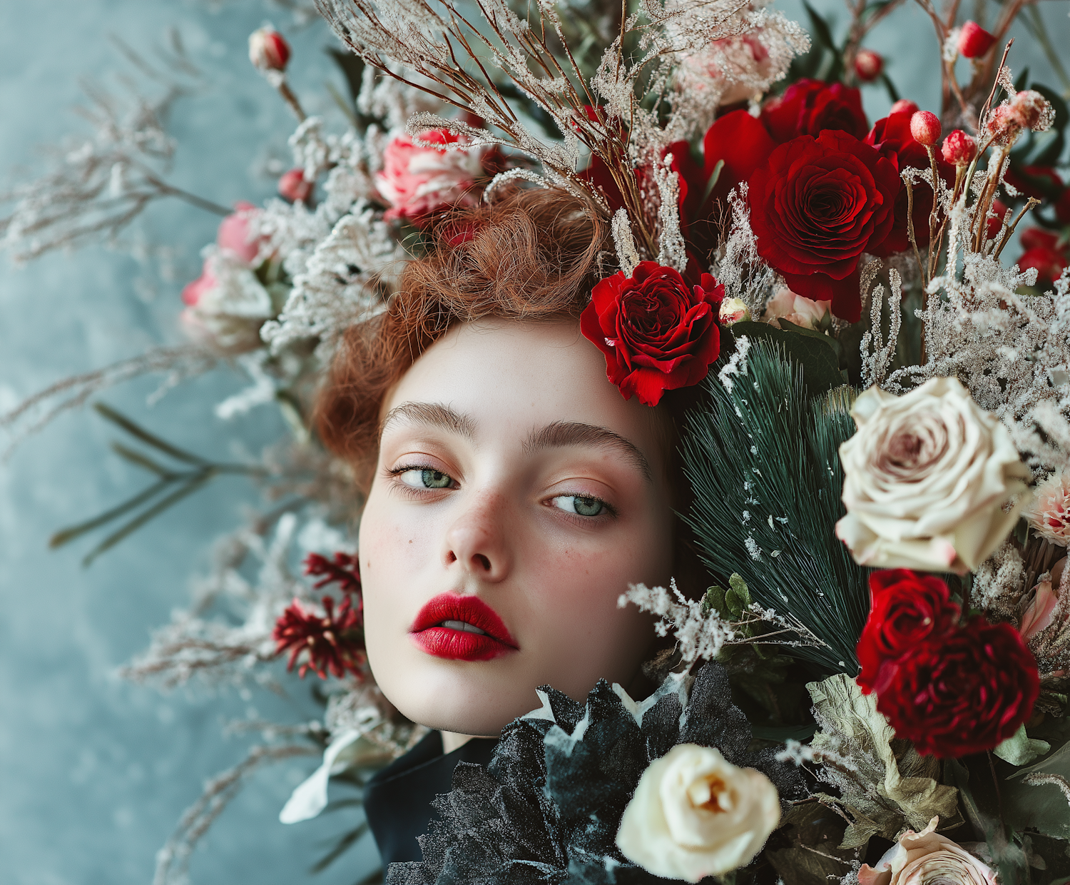 A serene woman with red lips surrounded by vibrant red and white roses, set against a soft blue background.
