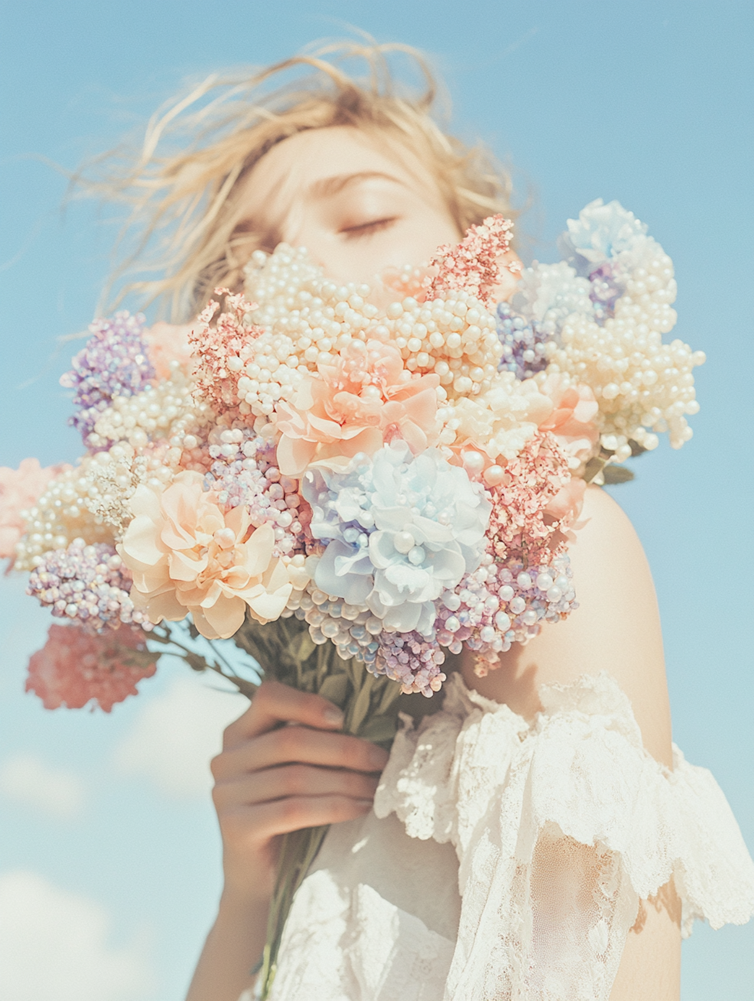 A dreamy portrait of a woman holding a pastel flower bouquet against a clear blue sky, evoking a serene and romantic atmosphere.
