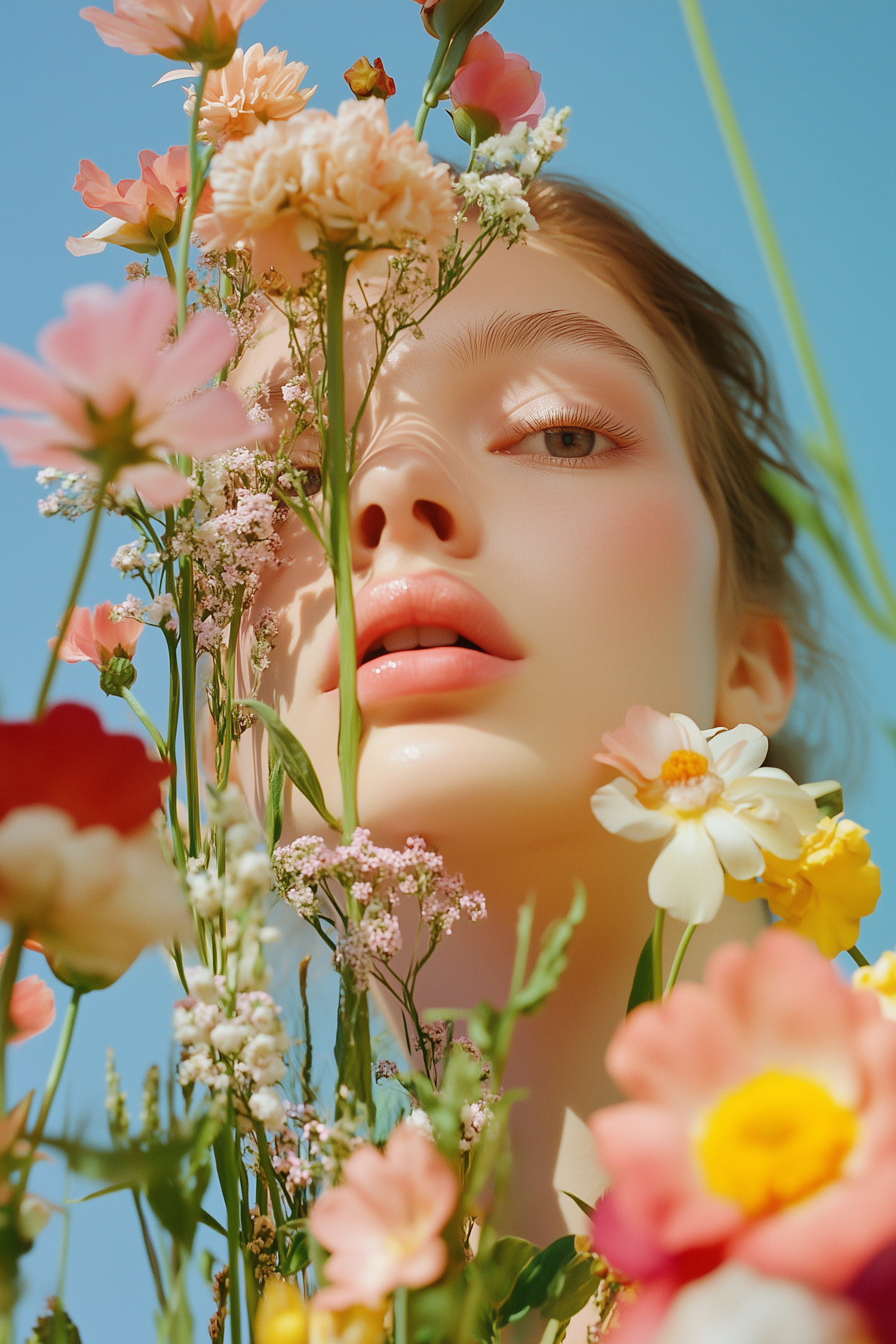A dreamy close-up of a woman surrounded by colorful flowers under a bright blue sky, blending natural beauty with vibrant blooms.