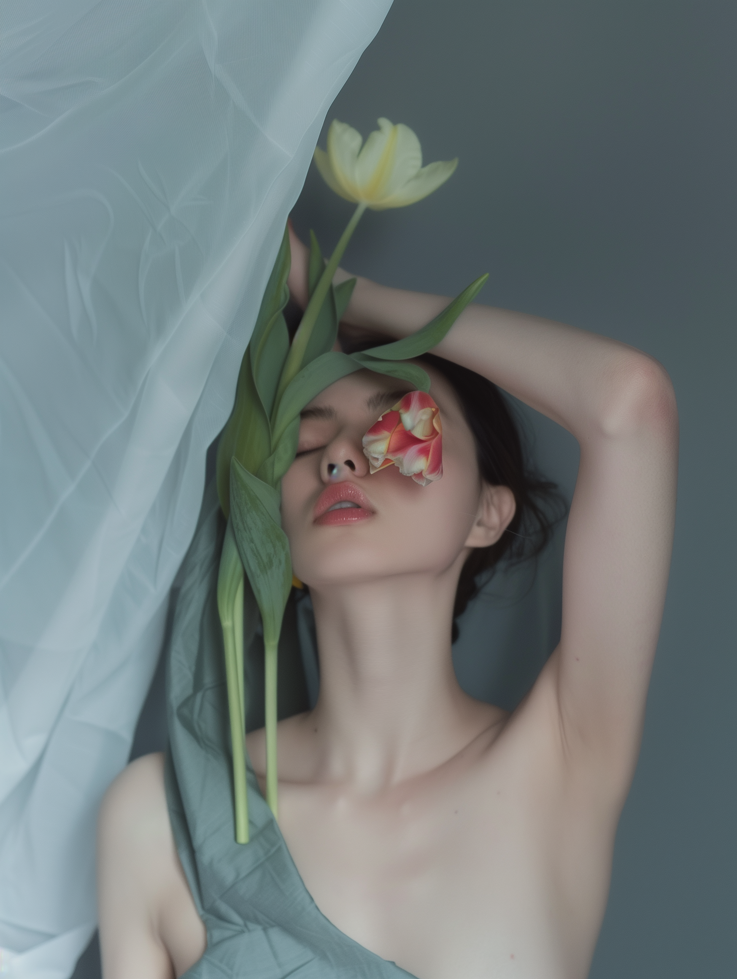 Artistic portrait of a woman with flowers, soft lighting, and muted tones creating a dreamy, surreal aesthetic.