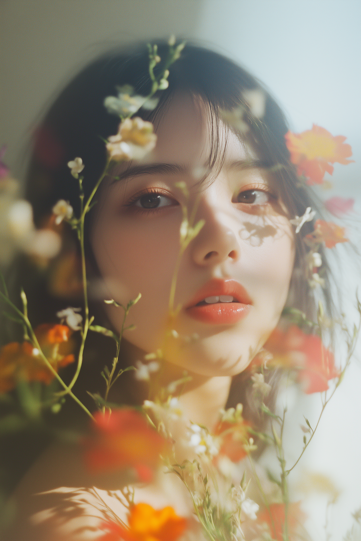 A serene portrait of a young woman surrounded by flowers, bathed in soft sunlight, creating a dreamy and ethereal atmosphere.