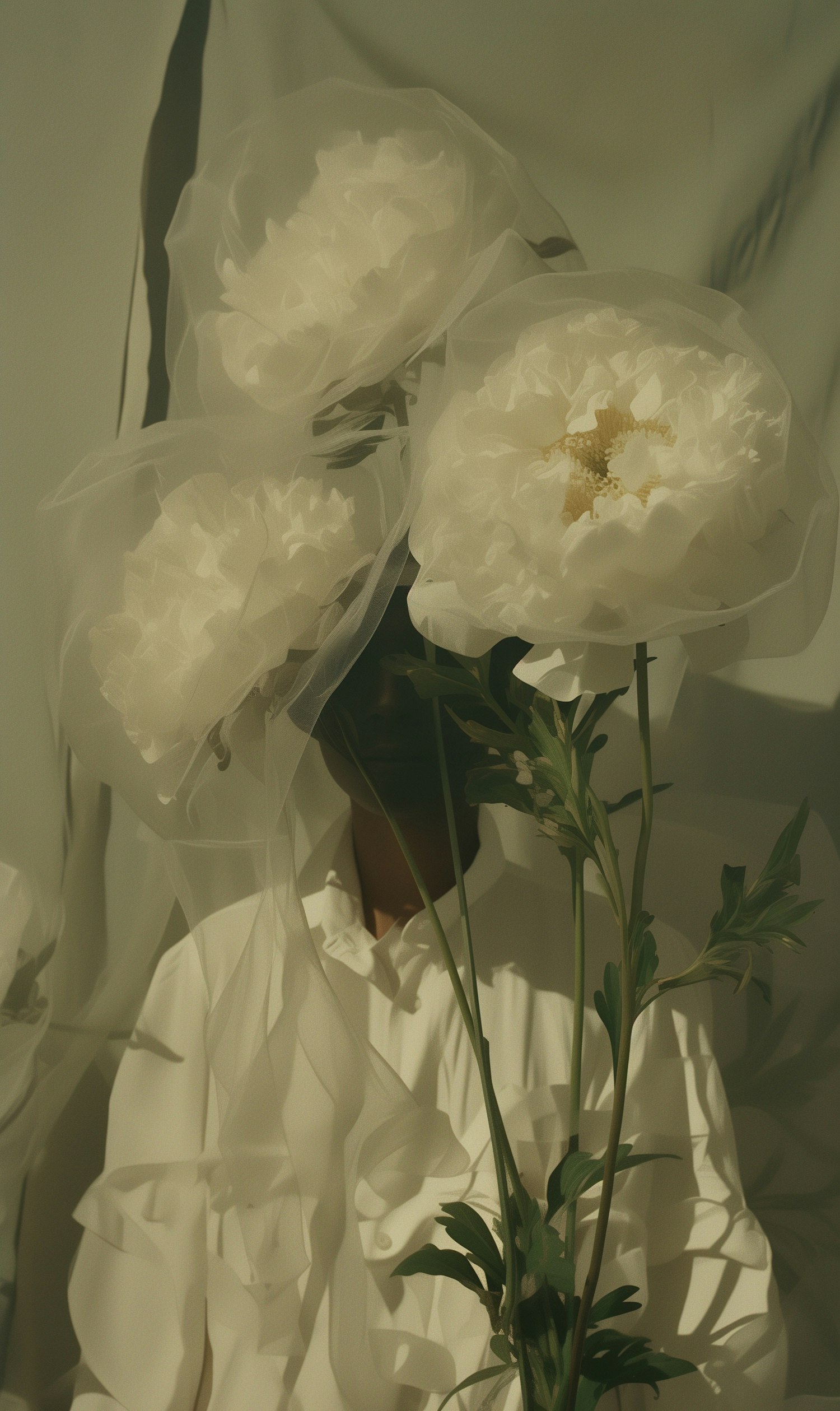 Ethereal scene with large white flowers and sheer fabric partially obscuring a person in white attire, set against a soft green background.