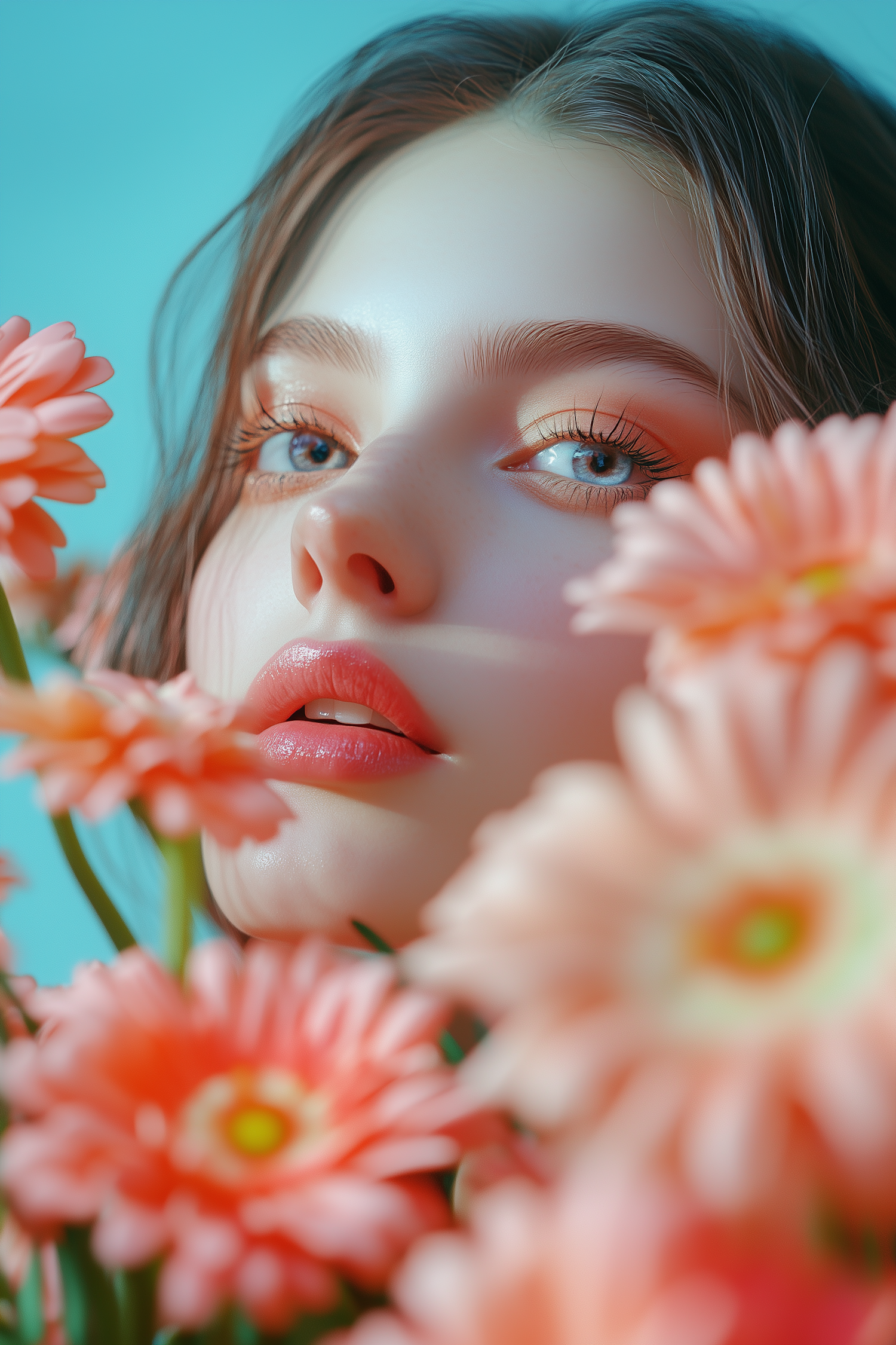 Close-up of a young woman with blue eyes and coral flowers, set against a turquoise background. Bright, dreamy, and vibrant aesthetic.