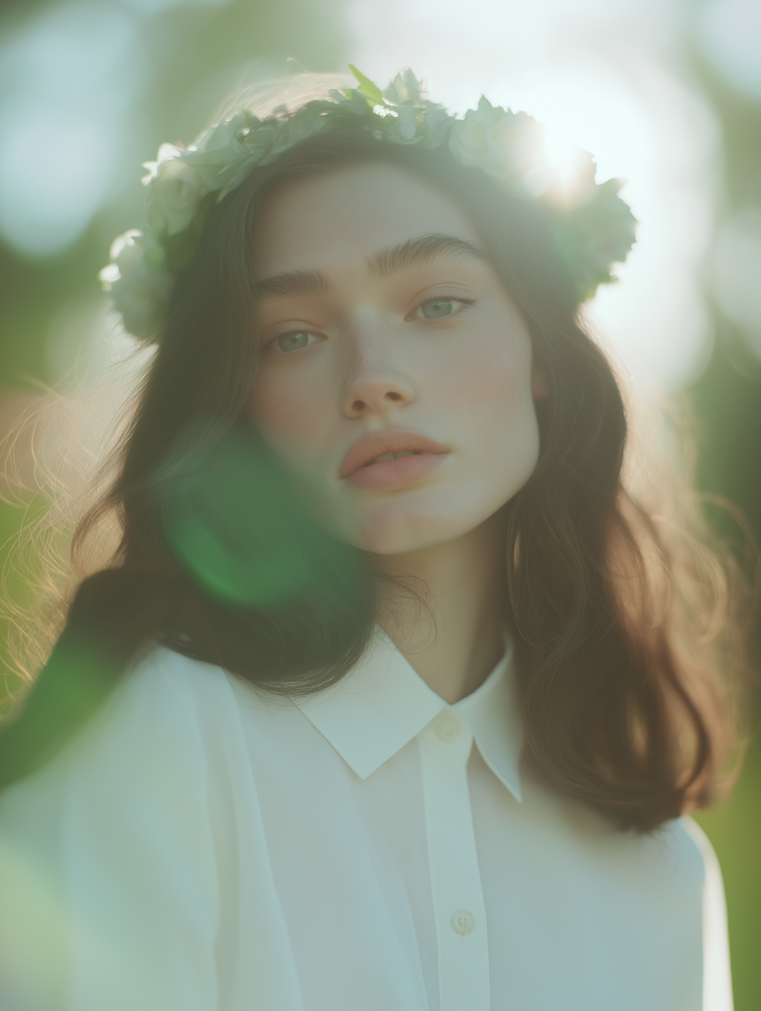 A serene portrait of a woman with a floral crown, soft sunlight, and a dreamy outdoor vibe. Perfect for nature-inspired aesthetics.