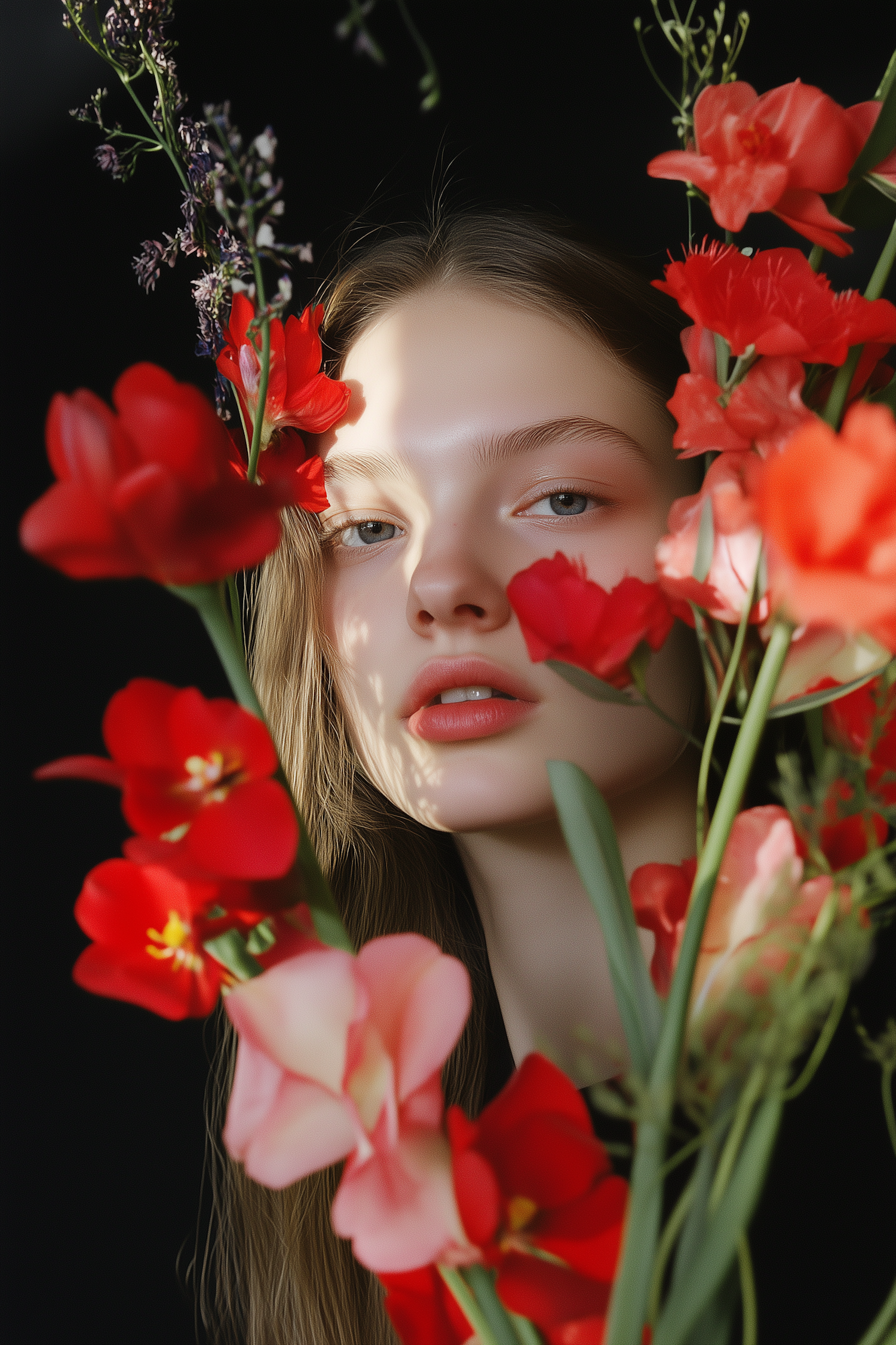 A serene portrait of a woman framed by vibrant red and pink flowers, with soft natural light and a dark background enhancing the scene.