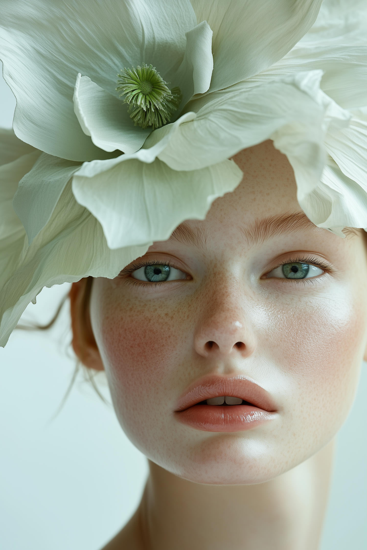 Close-up portrait of a freckled woman with a large white flower headpiece, light blue eyes, and natural pink lips.
