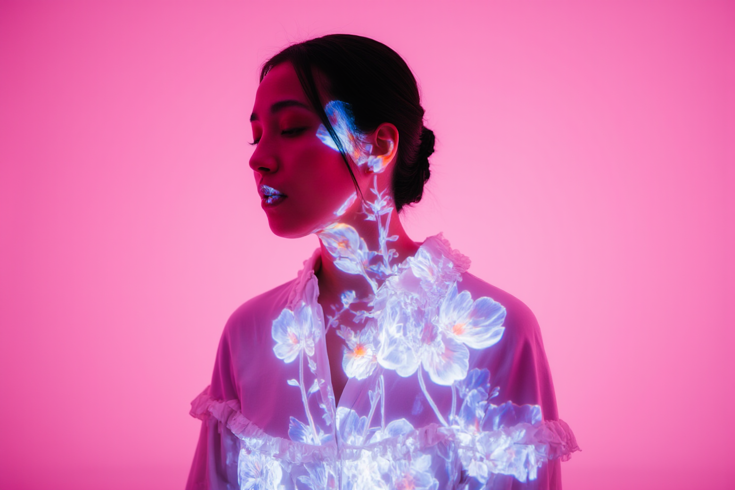 A serene woman in a white blouse with glowing floral projections on her, set against a vibrant pink background.