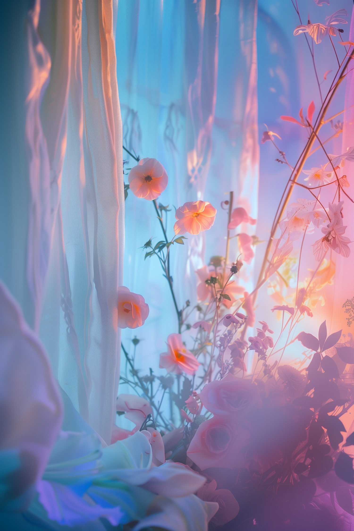Dreamy floral scene with pastel colors, soft light, and flowing curtains creating a serene and whimsical atmosphere.