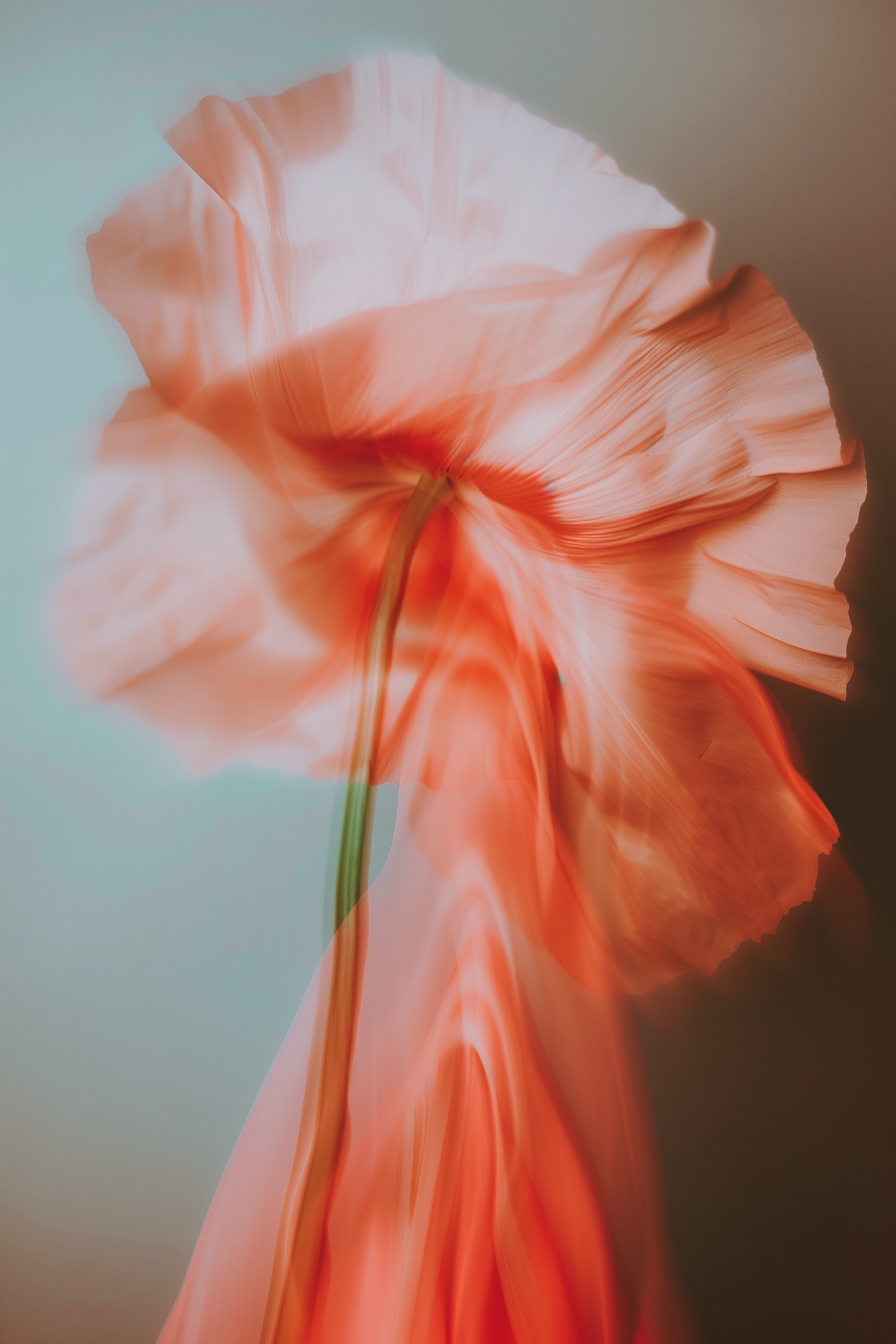Abstract close-up of a coral-pink flower with flowing petals and a soft teal background, creating a dreamy and ethereal vibe.