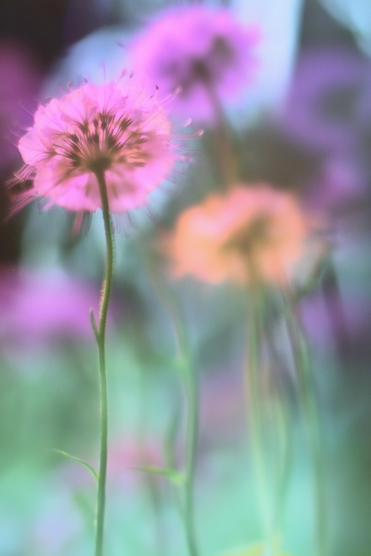 Dreamy soft-focus image of pink and orange flowers with pastel background, creating a serene and ethereal garden scene.