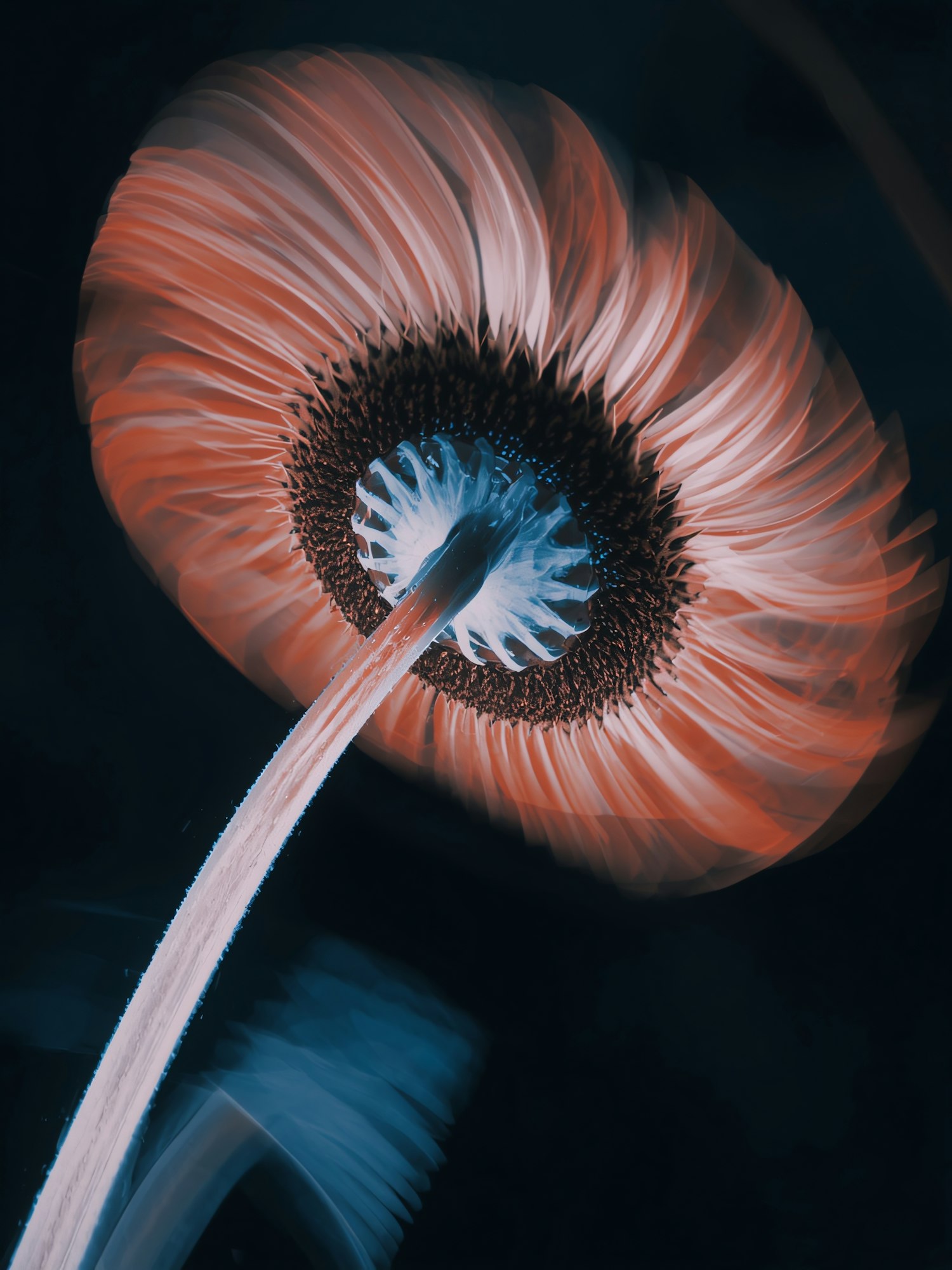 A stunning close-up of a flower's underside, with glowing orange petals and a cool blue stem, set against a dark background.