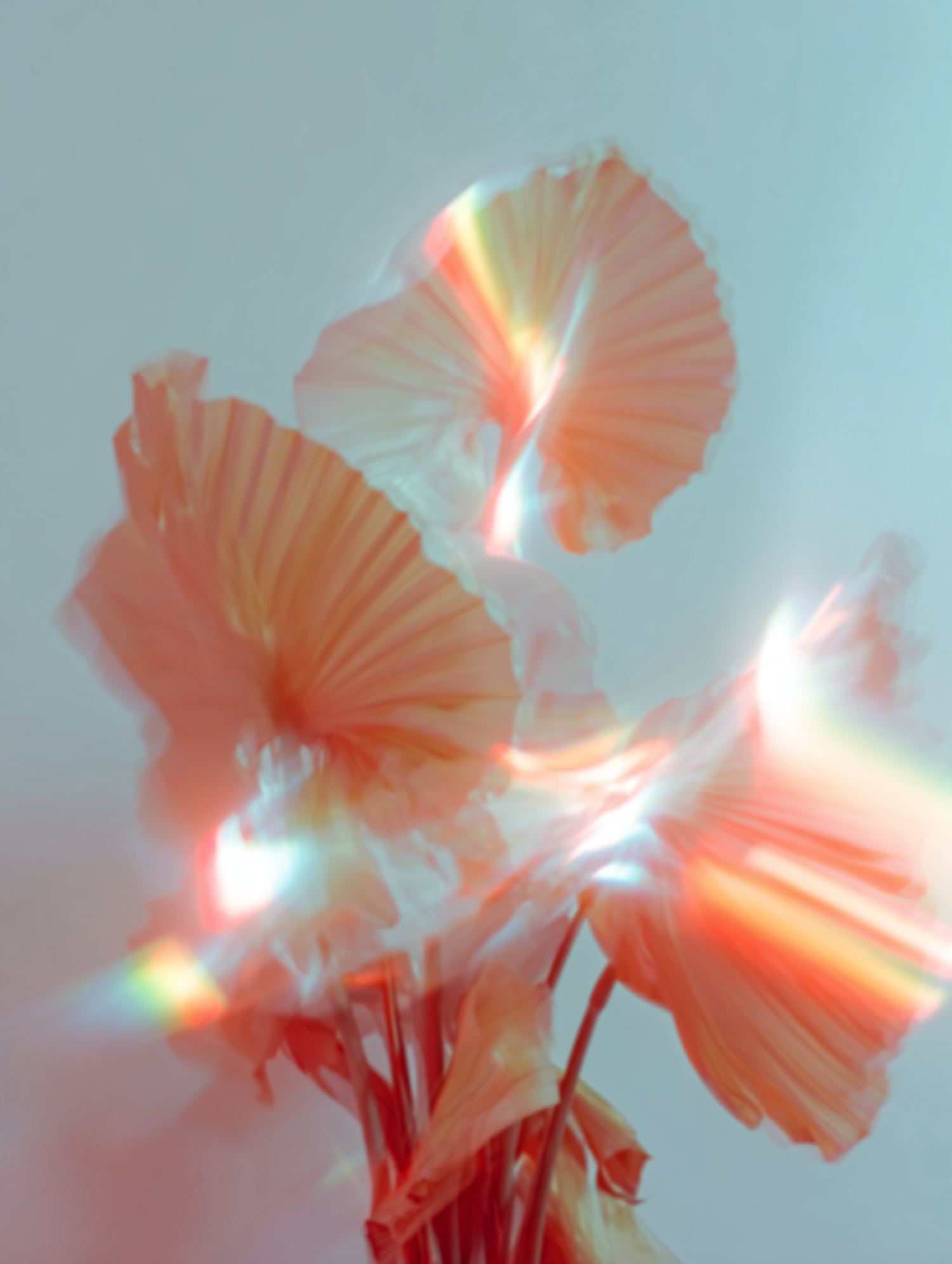 A dreamy floral arrangement with vibrant orange petals and refracted light effects creating a colorful, ethereal atmosphere.