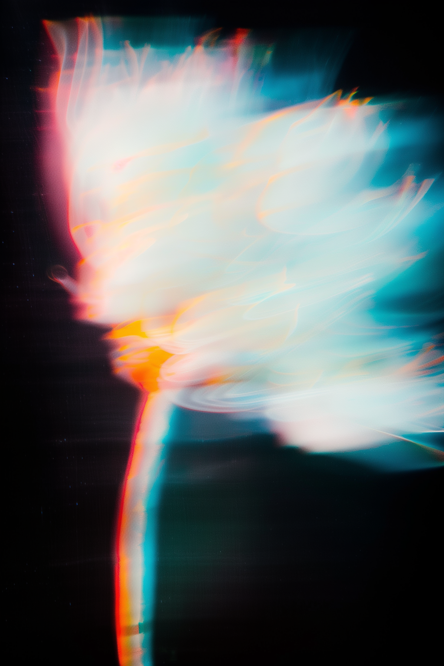Abstract blurred flower with glowing teal, orange, and white hues against a black background, creating a dreamy, ethereal effect.