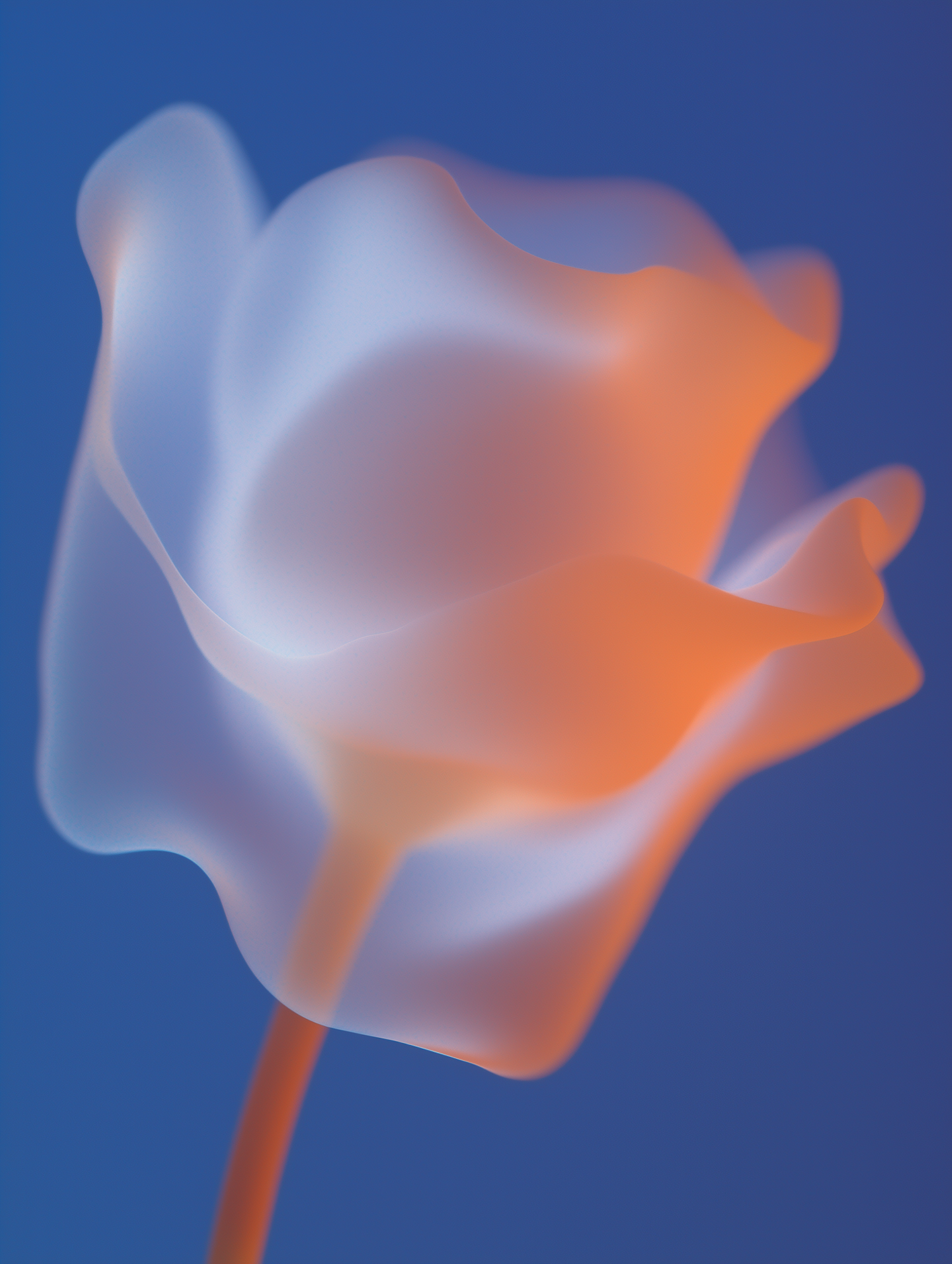 A glowing abstract flower with translucent white and orange petals against a solid blue background, creating a dreamy, ethereal vibe.