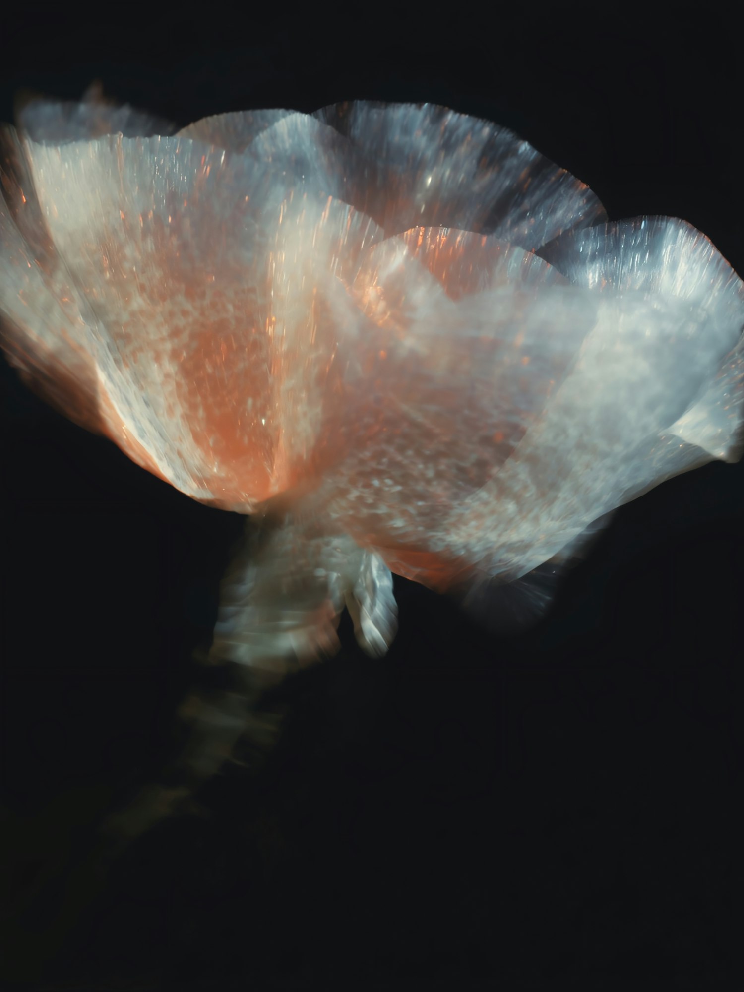 A glowing, translucent flower with shimmering orange and white petals against a dark background, creating a dreamlike, ethereal effect.