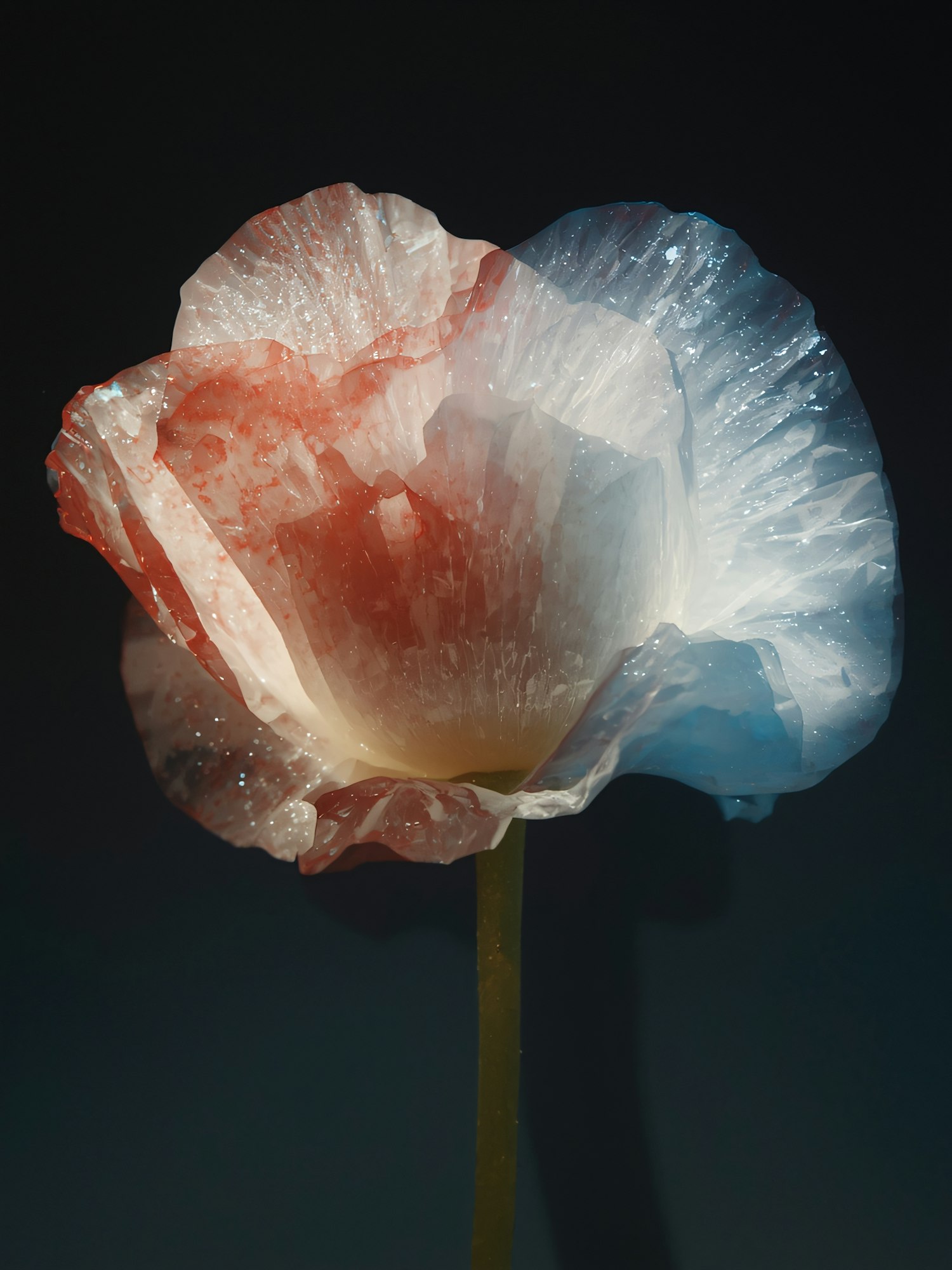 A stunning translucent flower with red, white, and blue hues, illuminated against a dark background, showcasing intricate details.