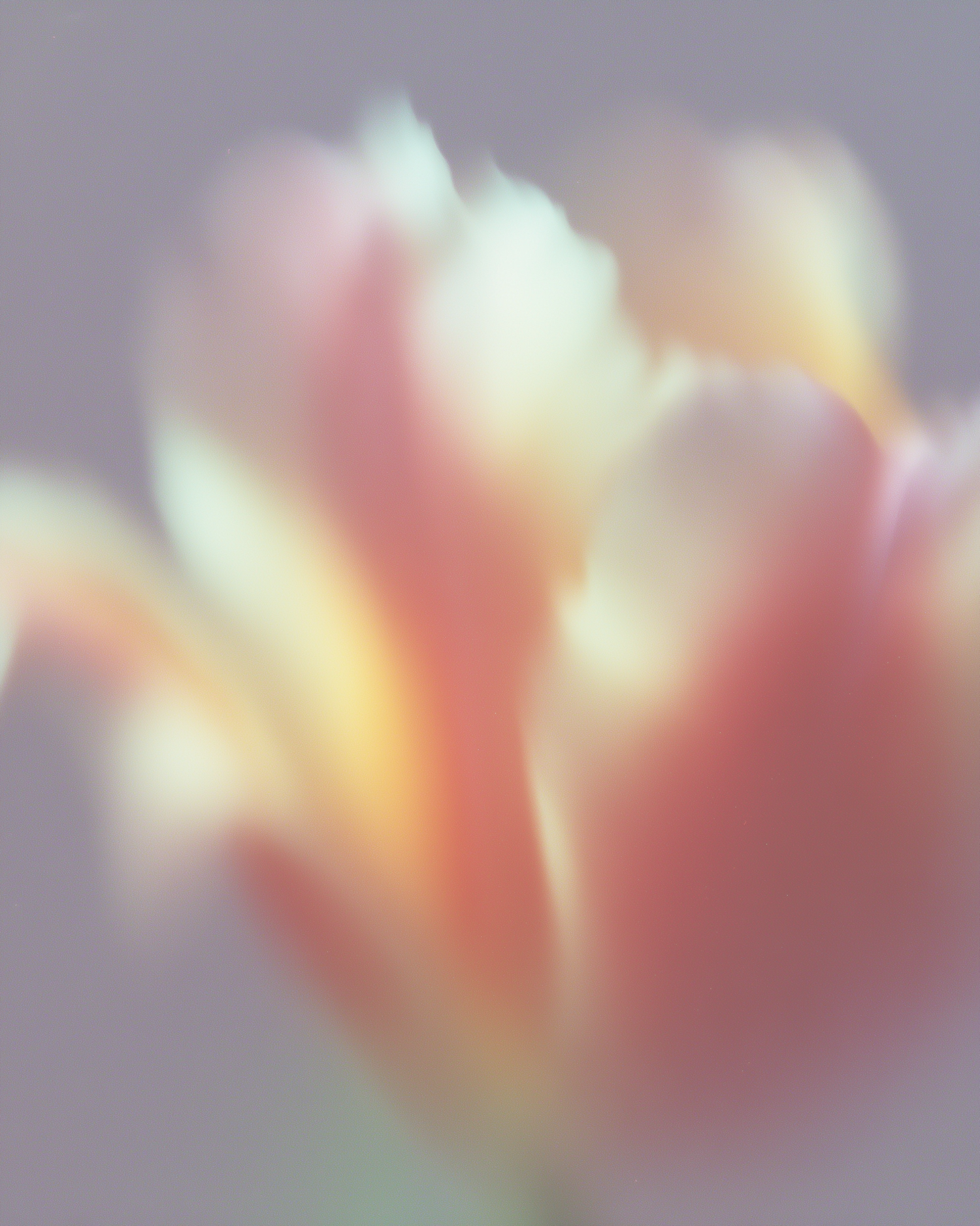 A dreamy, soft-focus image of a flower with pastel pink, orange, and cream hues against a muted background.