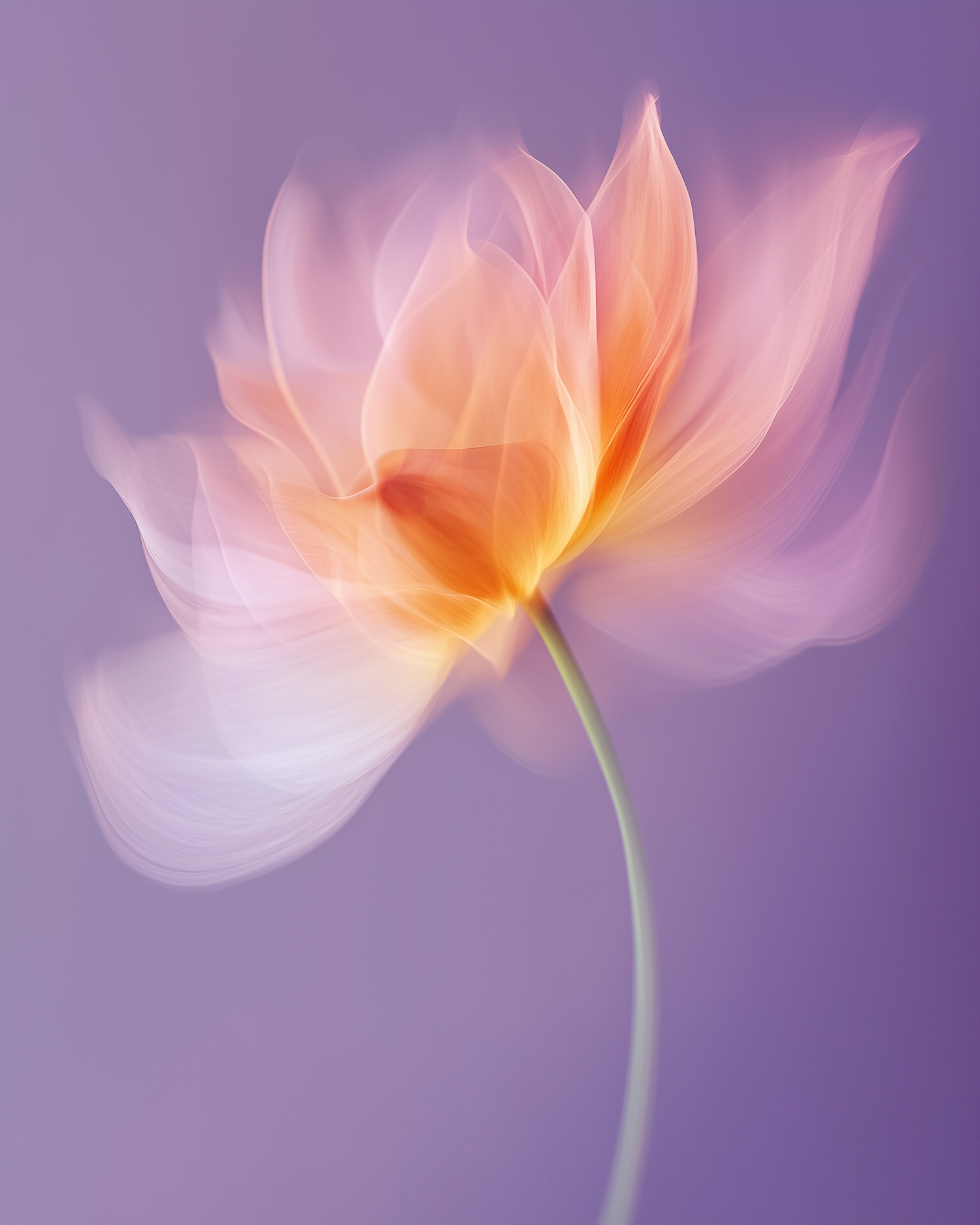 Ethereal flower with translucent orange and pink petals against a soft purple background, creating a dreamy, surreal effect.