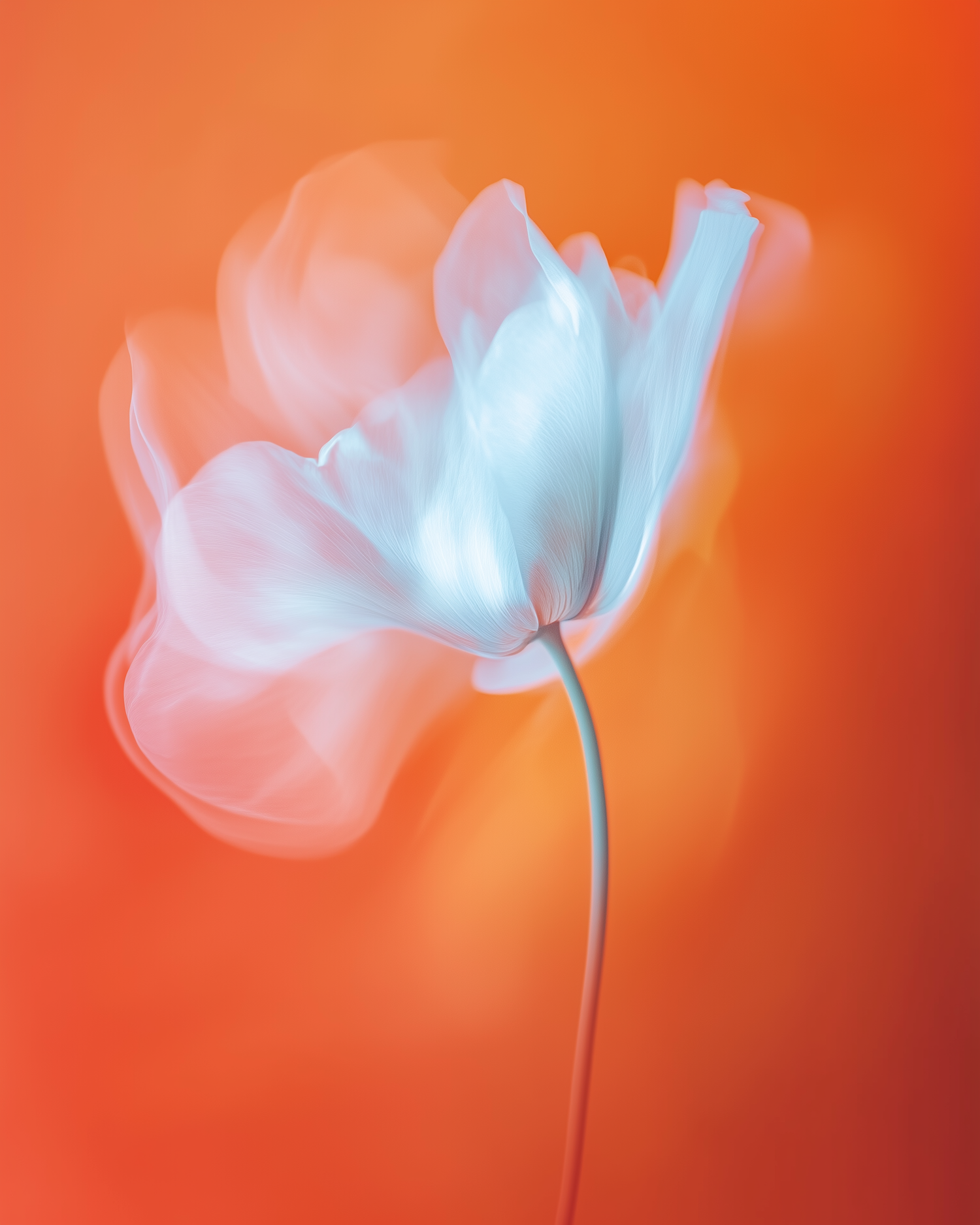 A delicate white flower with translucent petals against a vibrant orange background, creating a dreamy and ethereal effect.