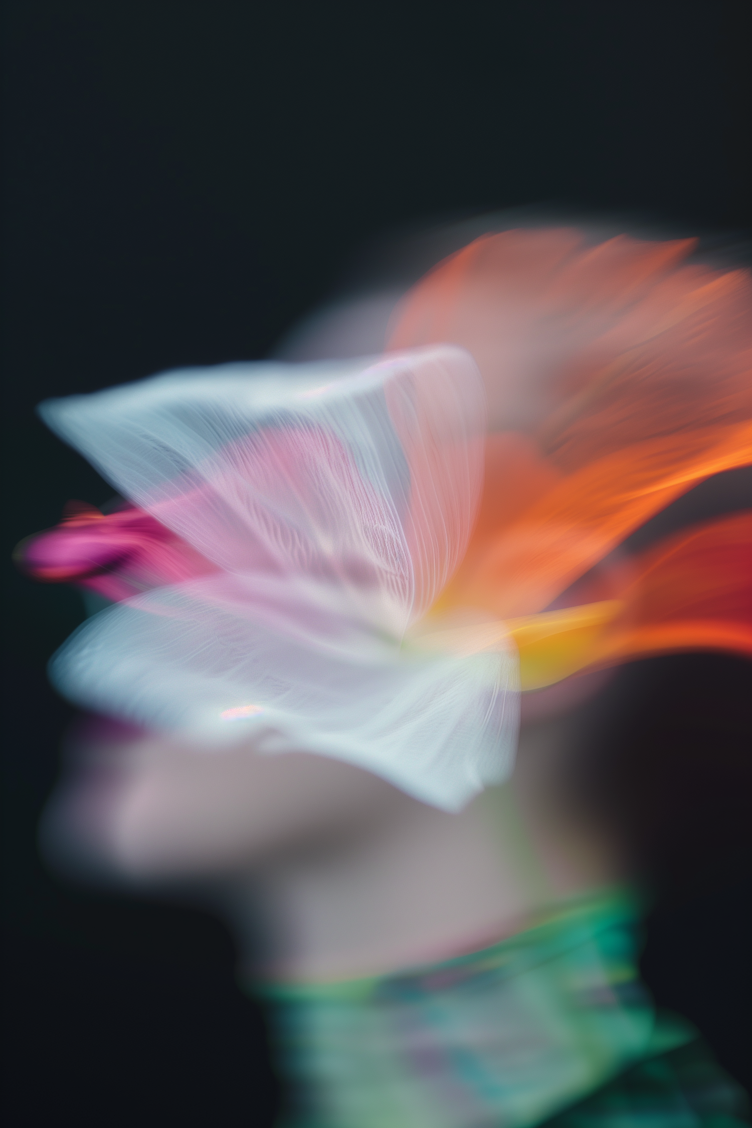 Abstract image of a blurred figure with a translucent flower-like structure in vibrant colors, creating a dreamy, surreal effect.