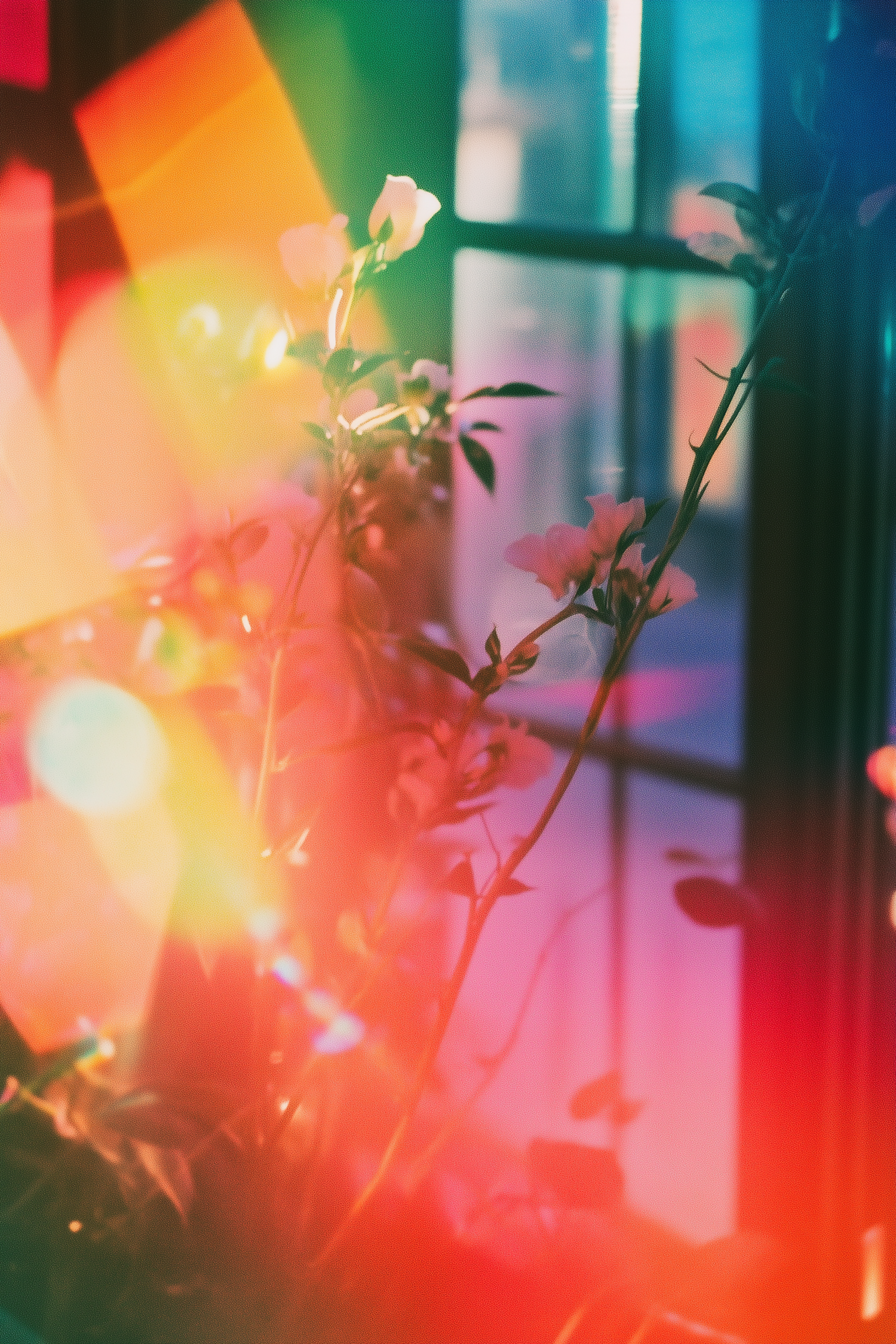 Dreamy floral scene with vibrant light leaks and bokeh, featuring delicate white blossoms against a blurred window backdrop.
