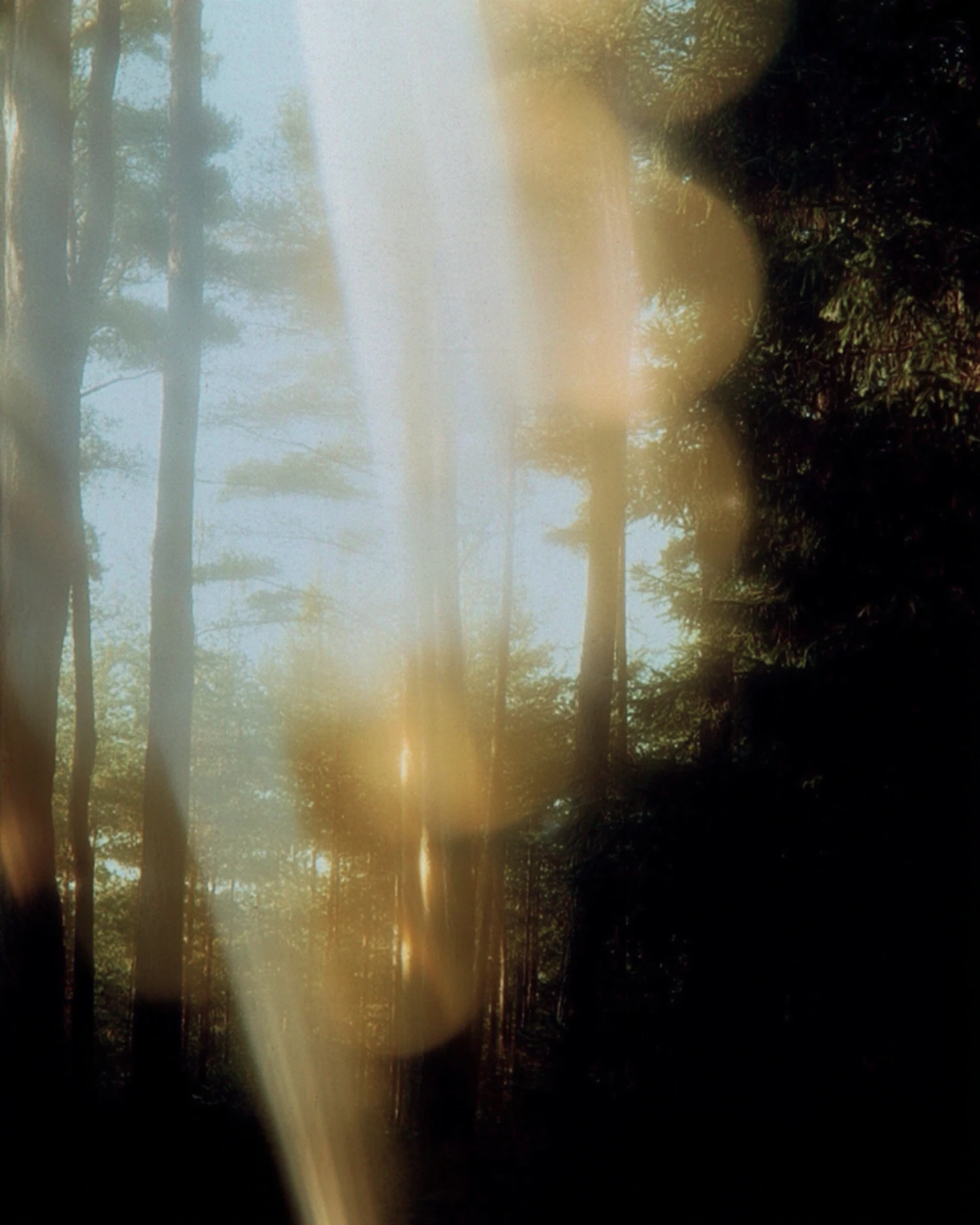 A dreamy forest scene with tall trees and golden light streaks, creating a serene and ethereal atmosphere.