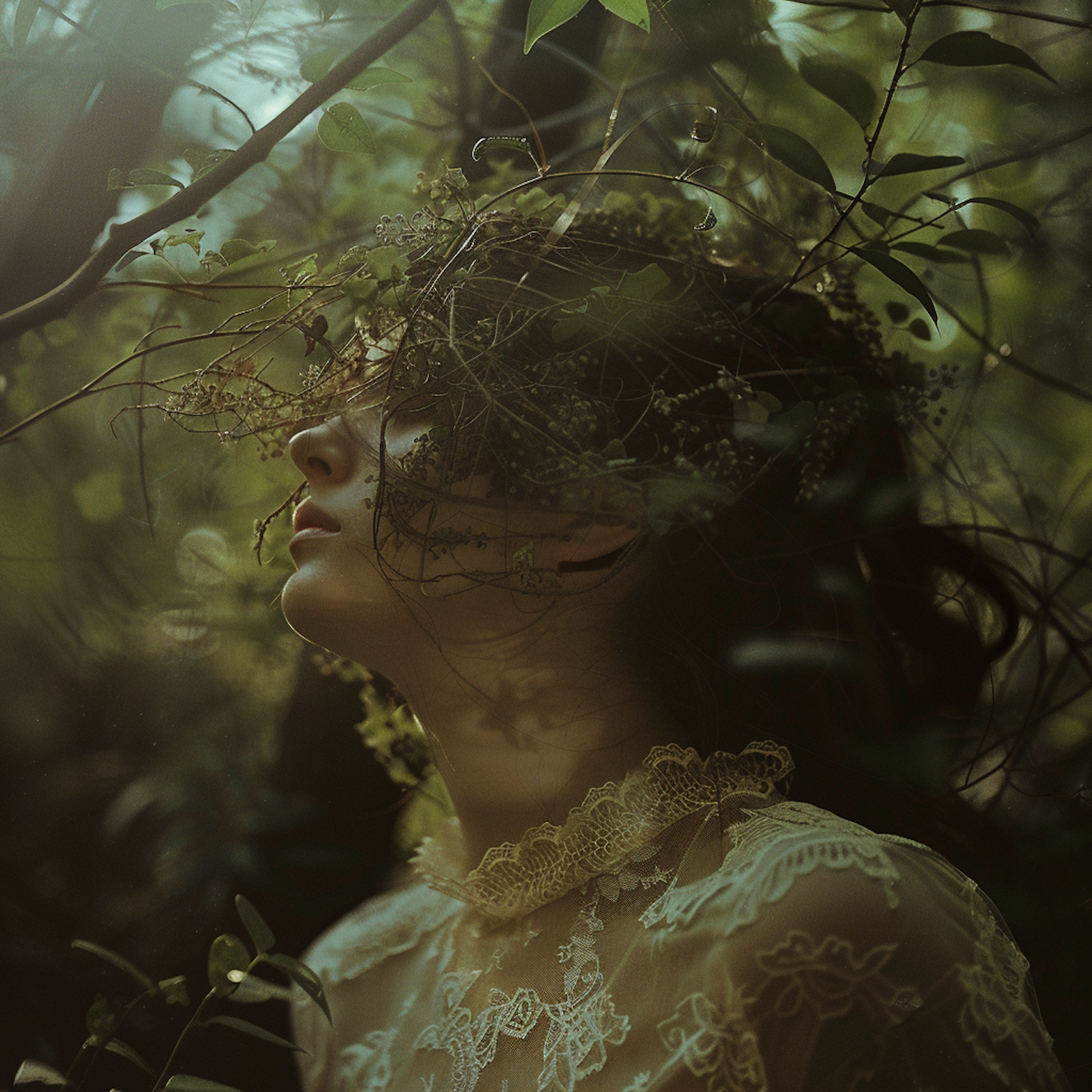 A serene woman in a lace dress surrounded by foliage, creating a dreamy, ethereal atmosphere with soft light and shadows.