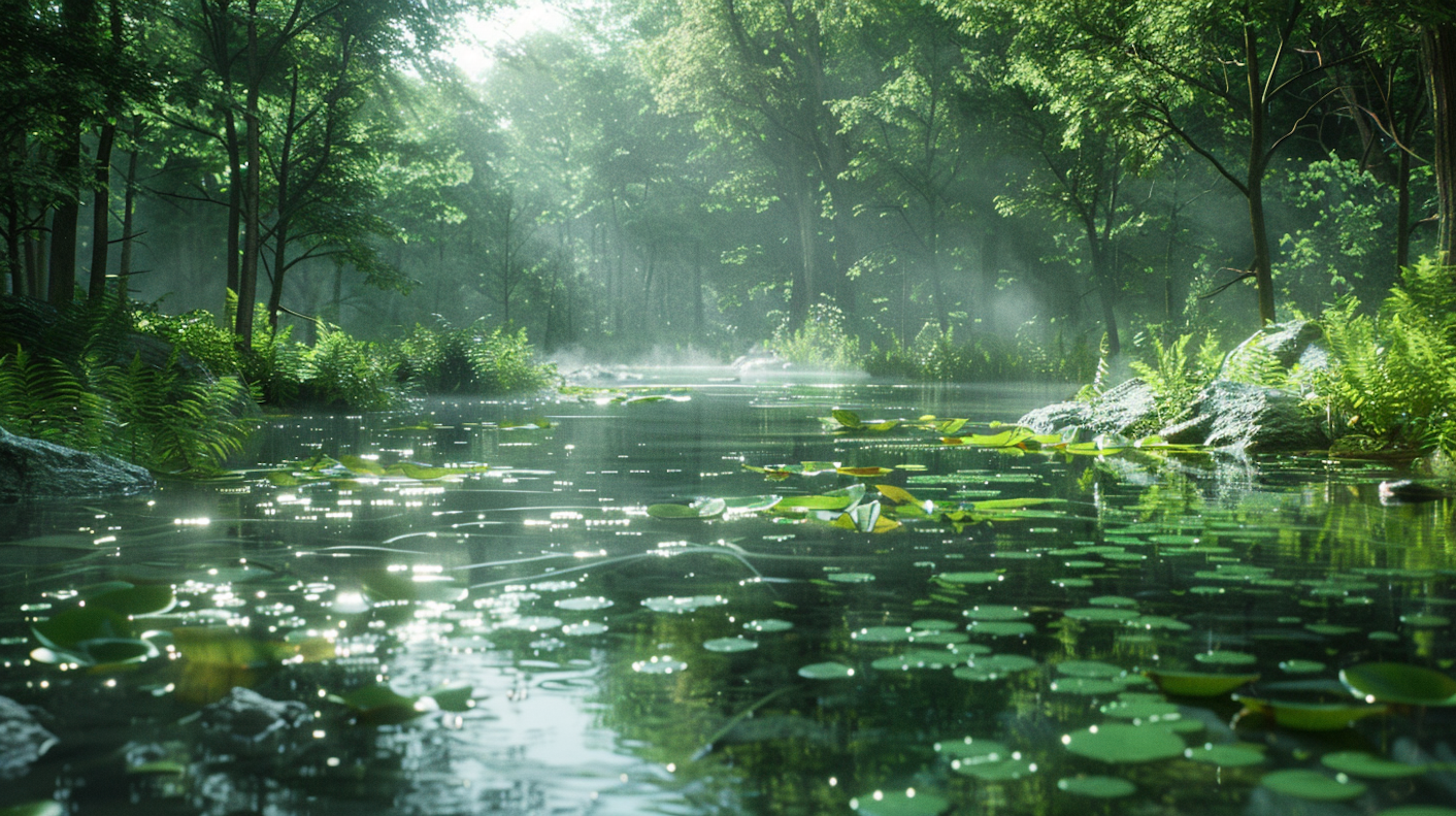 Tranquil forest river with lily pads, lush ferns, and sunlight reflections creating a serene and peaceful atmosphere.