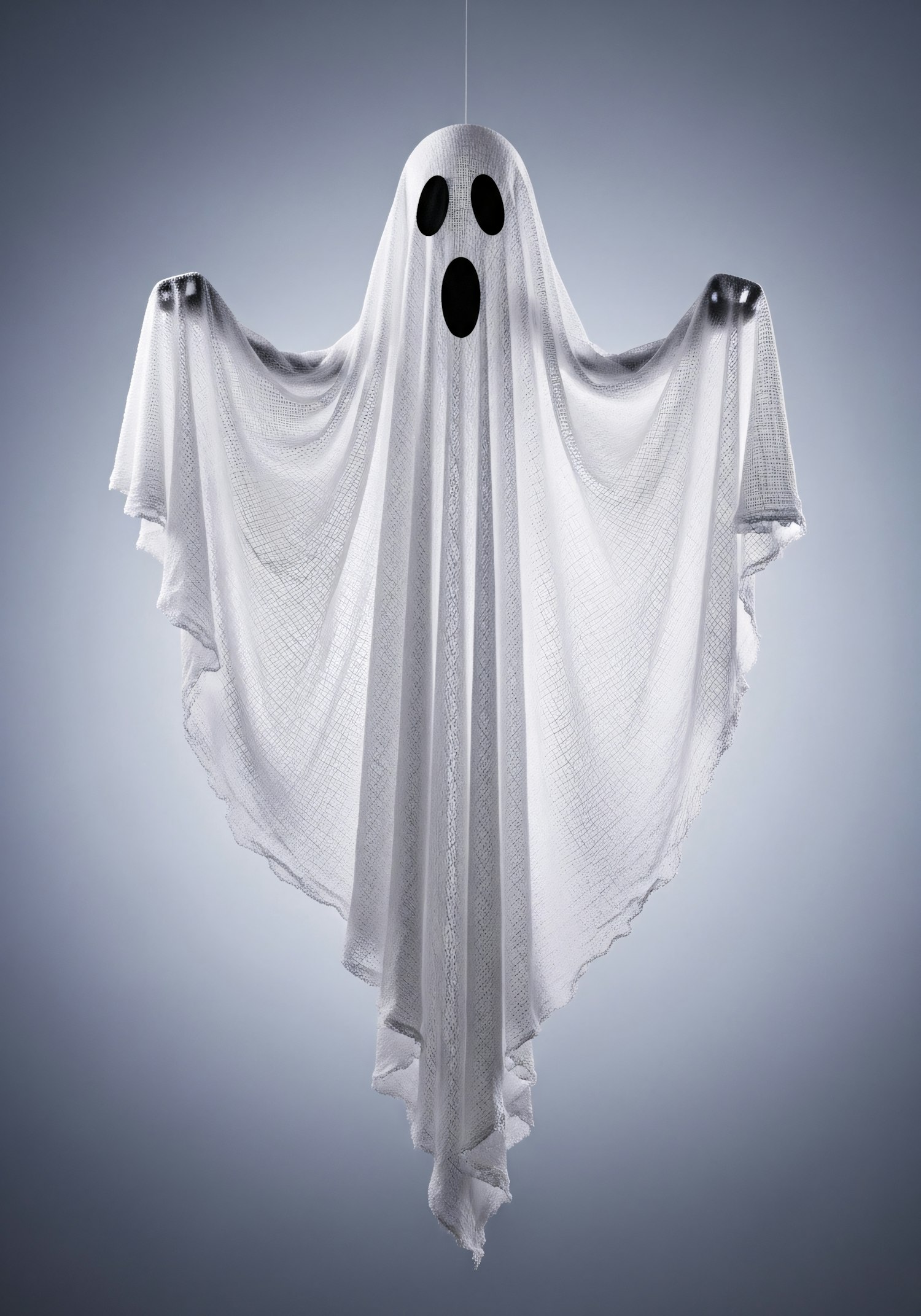 A ghostly figure made from a white sheet with cutout eyes and mouth, floating against a soft gradient background.