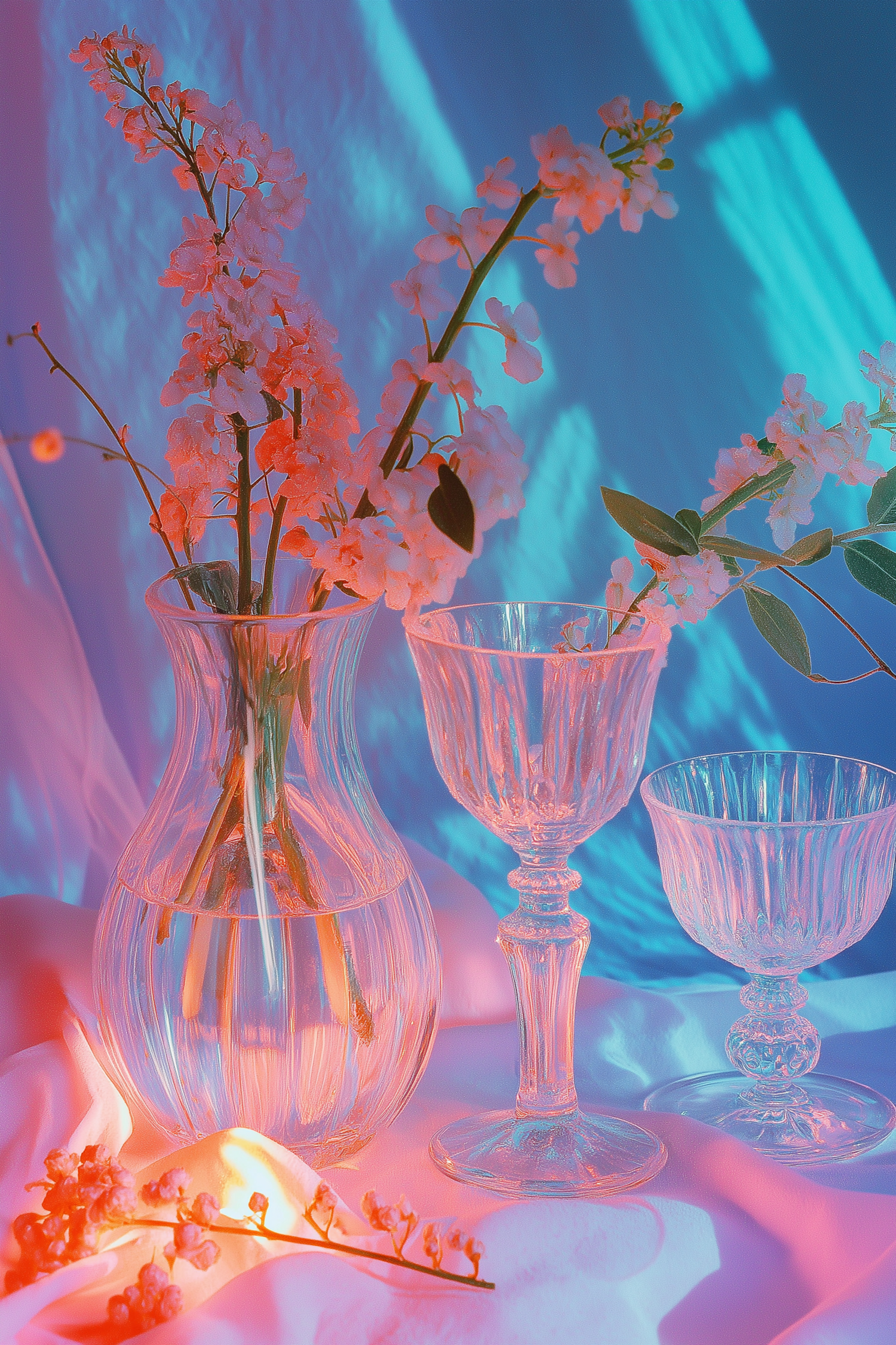 Elegant still life with pink flowers in a glass vase and goblets, bathed in ethereal pink and blue light, creating a dreamy atmosphere.
