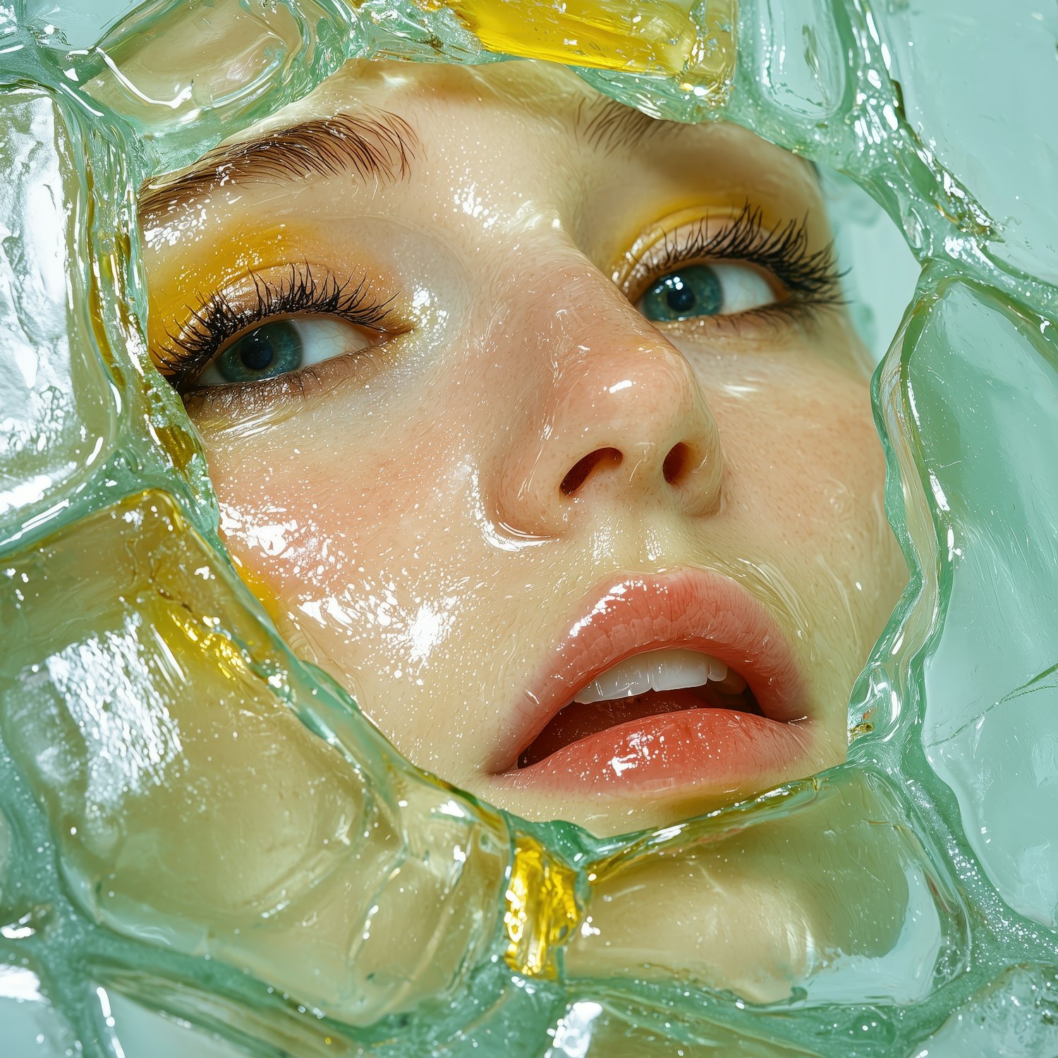 Close-up of a woman's face framed by glossy, translucent material with vibrant yellow eyeshadow and glossy lips for an artistic effect.