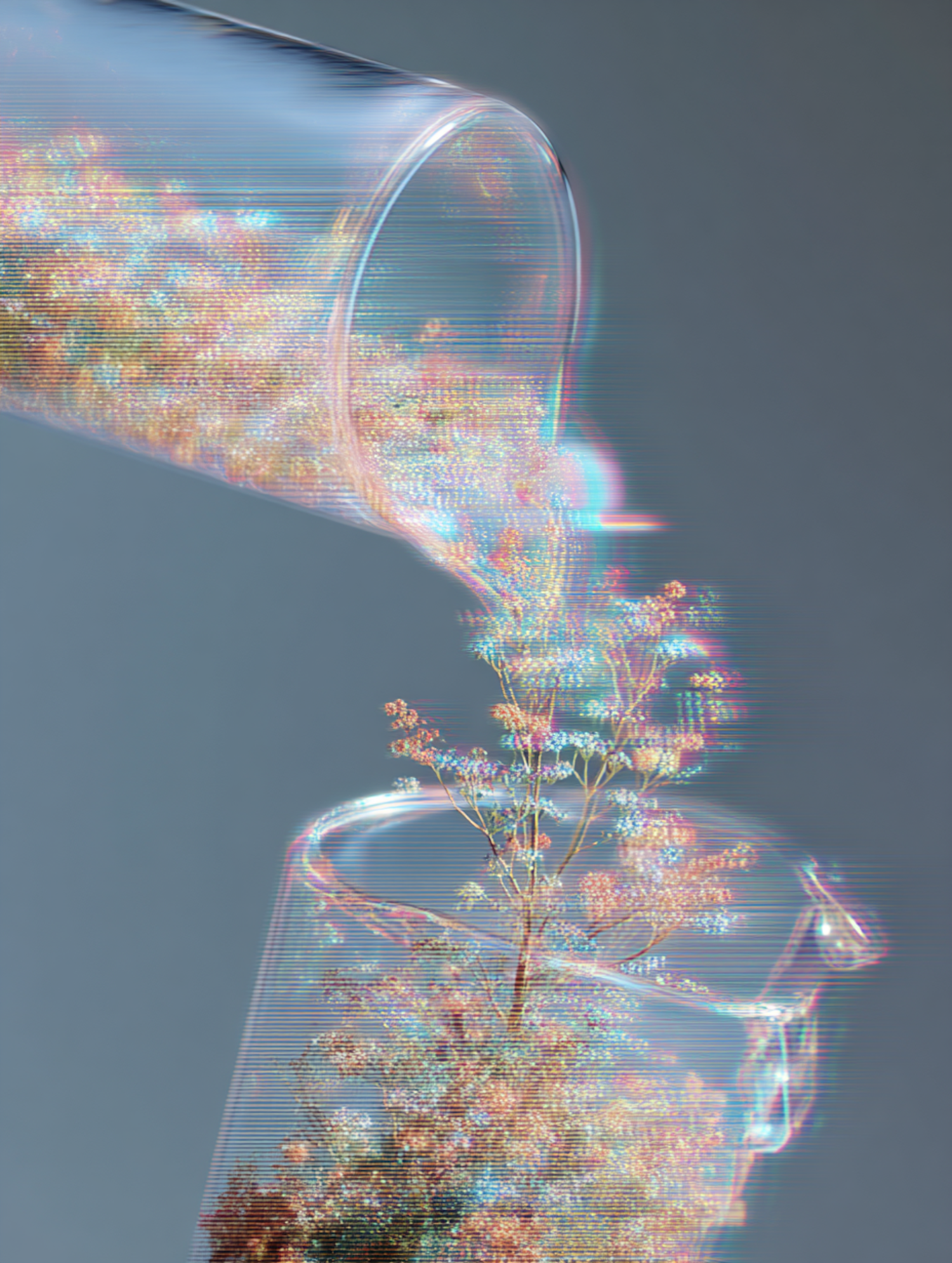 A surreal image of iridescent material flowing between glass vessels, forming delicate plant-like structures in a dreamlike setting.