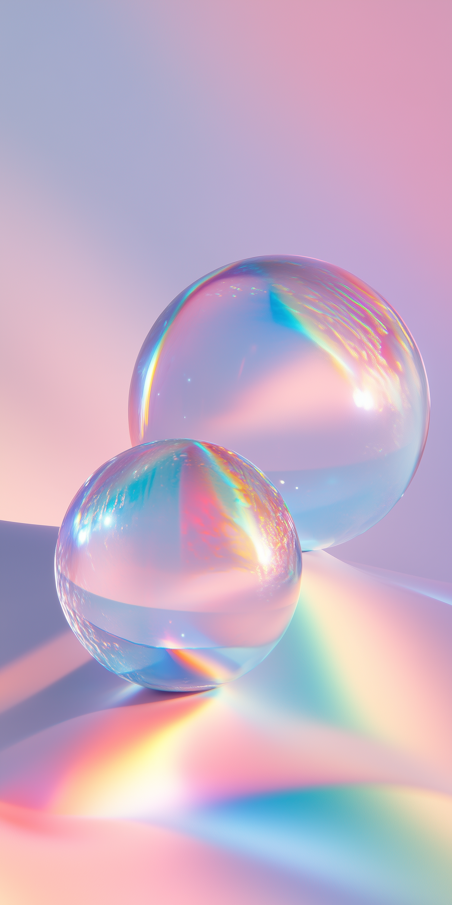 Dreamy glass spheres refracting light into vibrant rainbows on a pastel gradient background. A surreal and calming visual delight.