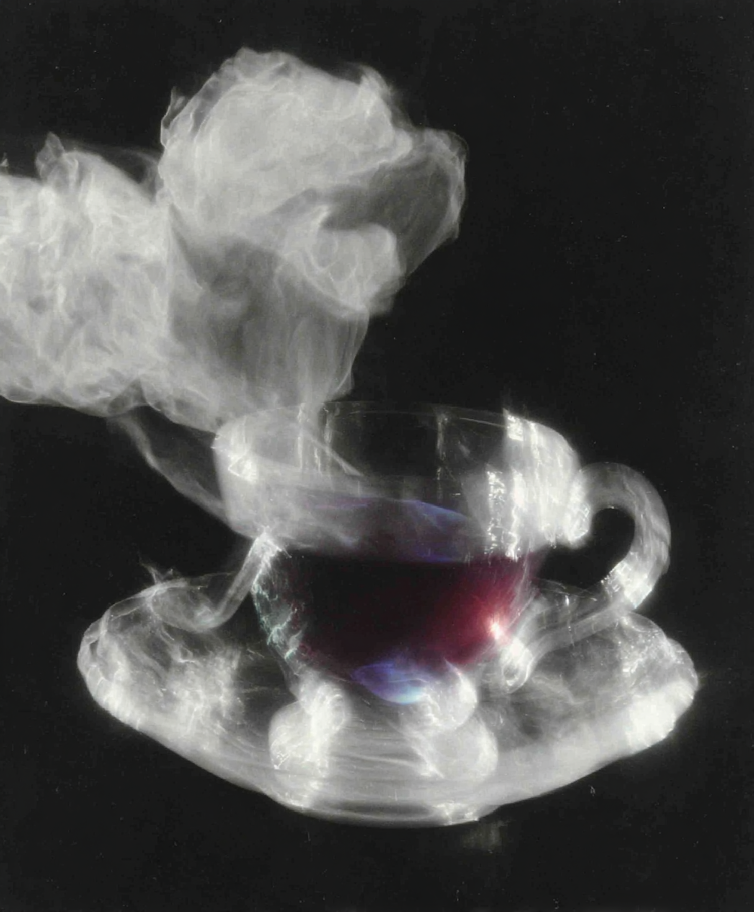 A glowing glass teacup with steam rising, set against a dark background, creating an ethereal and artistic atmosphere.